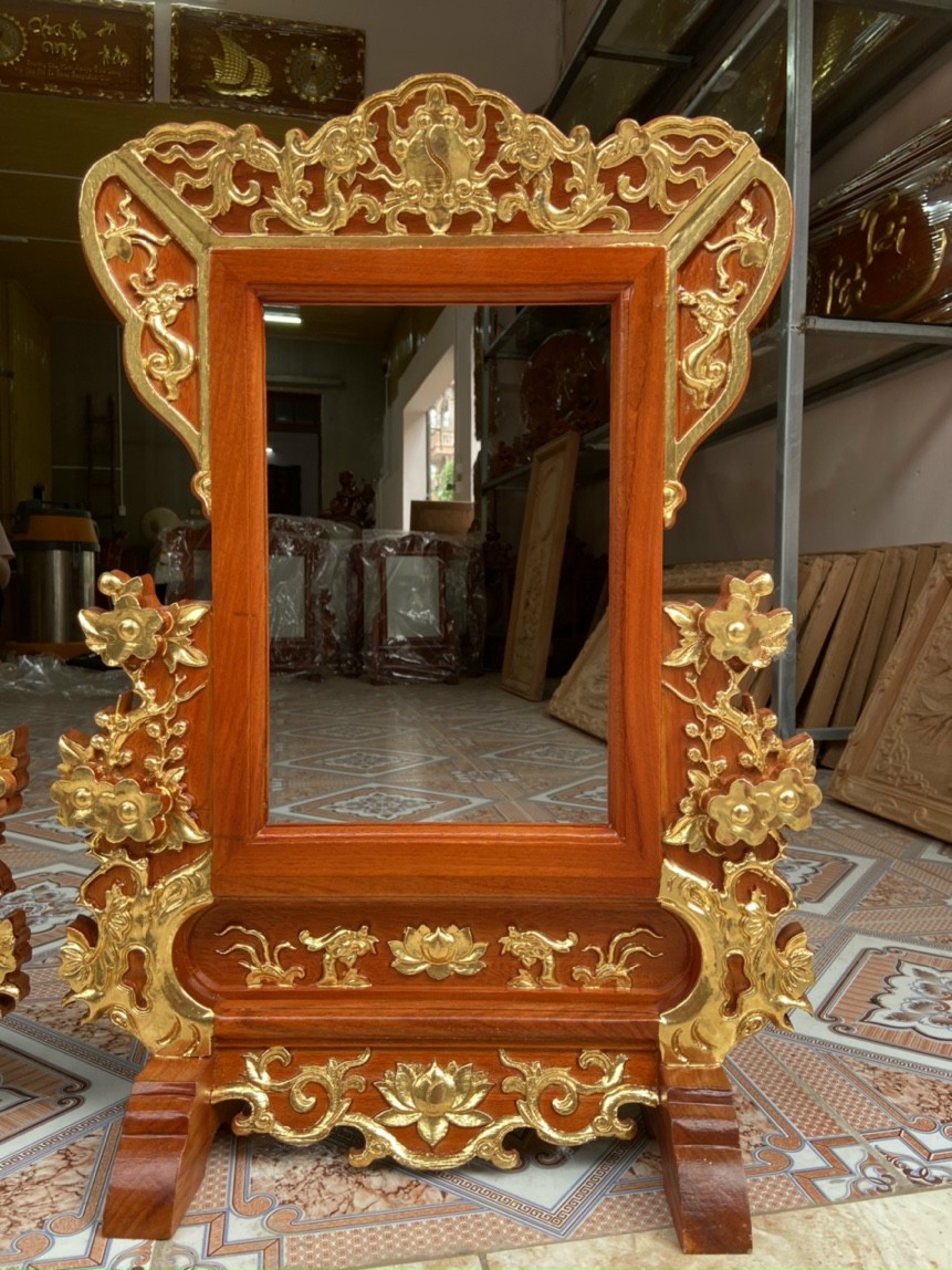 _ Khung ảnh thờ cúng được làm bằng chất liệu gỗ gõ đỏ tự nhiên 100% .Và được sơn pu dát vàng cao cấp _ Kích thước khung viền ngoài ngang 50cm cao 65cm sâu