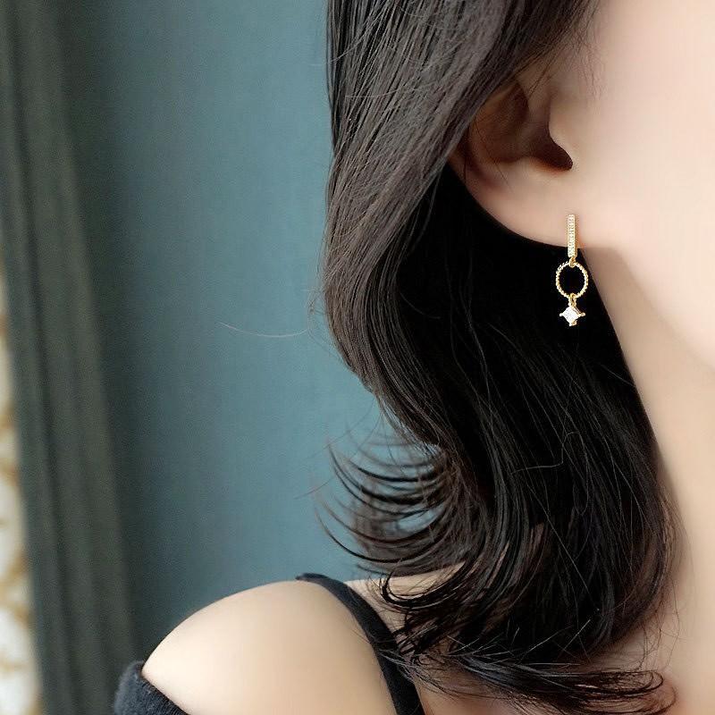 Khuyên tai bạc 925 thiết kế bất đối xứng vòng tròn kết hợp thanh bạc cùng nụ đá cá tính mới lạ độc đáo Dế Bạc - K5723