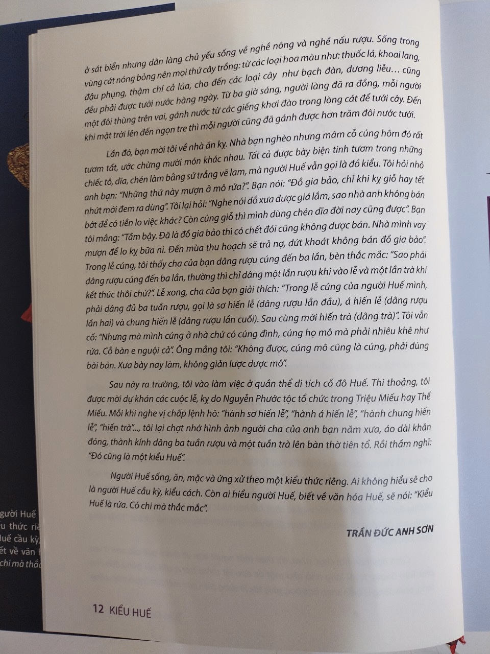 Sách mới Kiểu Huế Tác giả: Trần Đức Anh Sơn Nxb Tổng hợp TP Hồ Chí Minh, phát hành vào 12/2021. Sách khổ 1827cm, (khổ như cuốn Từ điển nhà Nguyễn), bìa cứng có áo bìa, ruột in 4 màu, có 450 ảnh minh họa nội dung bài viết. Bản giới hạn đánh số Có ký tặng của tác giả. … Giới thiệu: Dưới đây là mục lục của sách, có bổ sung 12 bài, là những bài có đánh dấu (), so với bản in lần đầu: THAY LỜI TỰA LỄ NGHI & LỐI SỐNG Lễ hội cung đình triều Nguyễn Tết Huế Lễ tết ở Huế (*) Xuân du phương thảo địa Thu vàng xứ Huế Hoa của làng CHỐN Ở Phủ đệ - nơi lưu giữ Huế xưa Vương phủ của Thi Ông, Thi Bá Hồn Huế trong Lạc Tịnh Viên