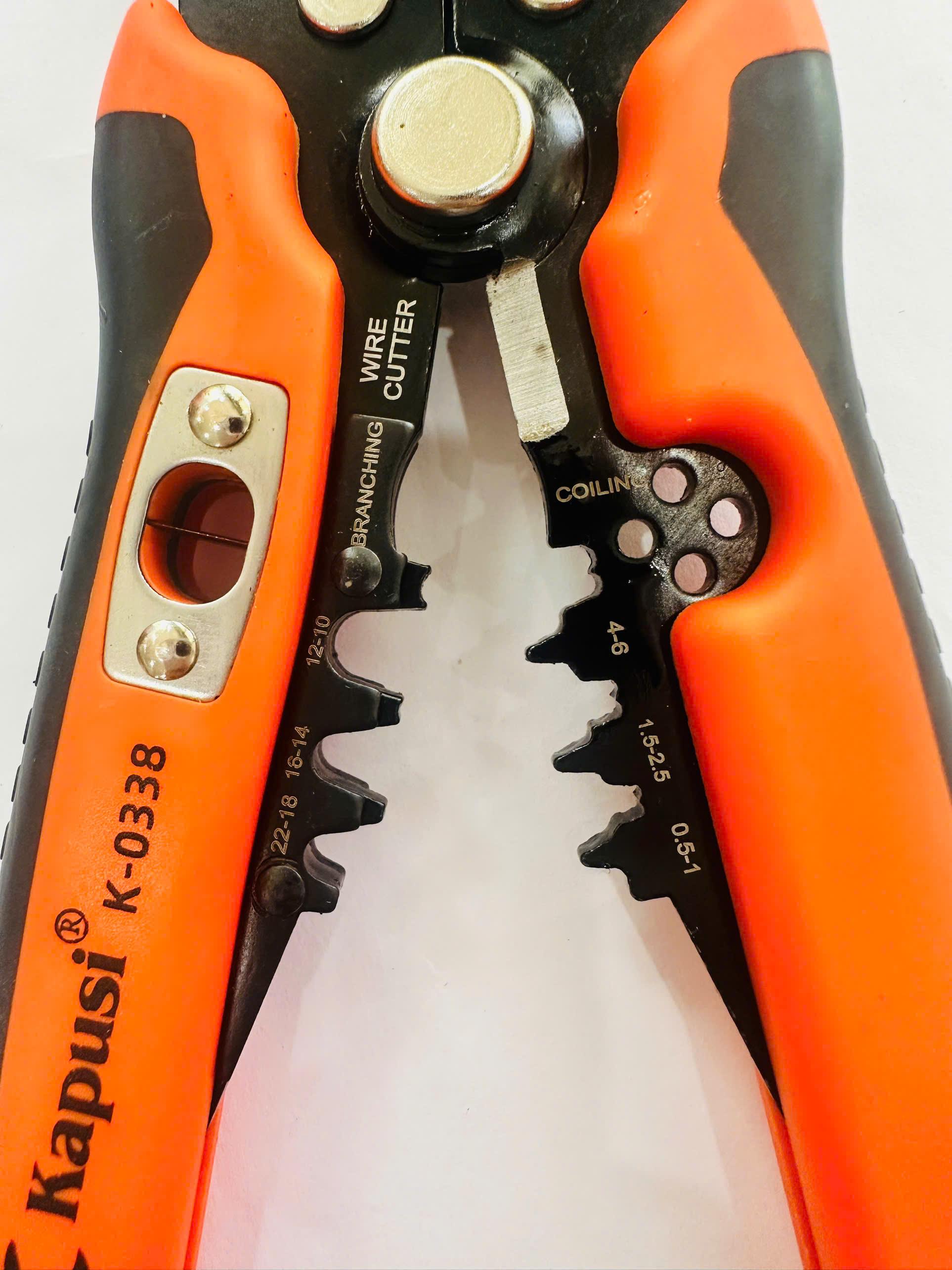 Kìm tuốt dây đa năng Kapusi K-0338 là công cụ chuyên dụng giúp tuốt vỏ dây điện, cắt dây và bấm cos nhanh chóng, chính xác.