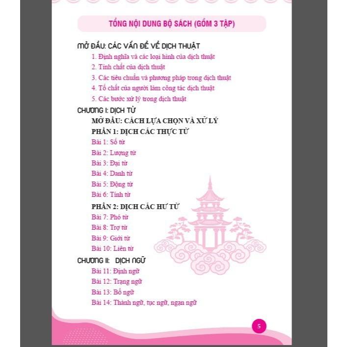 Bộ giáo trình gồm 03 tập: Tập 1 (trình độ sơ – trung cấp); Tập 2 (trình độ trung cấp); Tập 3 (trình độ trung – cao cấp), được chia làm 6 chương, 27 bài với các nội dung cụ thể như sau: MỞ ĐẦU giới thiệu một cách khái quát, súc tích các vấn đề về dịch thuật, cung cấp cho người học kiến thức cơ bản liên quan đến lý thuyết dịch thuật.