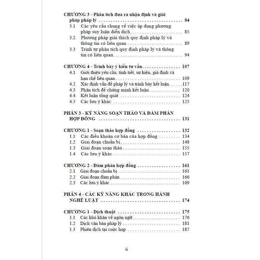 - Các kỹ năng cơ bản trong việc hành nghề luật sư là (i) nghiên cứu và phân tích, (ii) trình bày ý kiến tư vấn và (iii) soạn thảo và đàm phán hợp đồng được viết lại gần như hoàn toàn và chi tiết hơn để bạn đọc có thể áp dụng trên thực tế dễ dàng hơn. Trong các phần này, tác giả chủ yếu sử dụng một ví dụ về giao dịch mua bán, sáp nhập công ty để bạn đọc có thể hình dung toàn bộ một quá trình tư duy cơ bản của luật sư từ việc nghiên cứu và phân tích các vấn đề pháp lý và trình bày các vấn đề pháp lý với khách hàng đến việc soạn thảo và đàm phán hợp đồng cho khách hàng. Quá trình nghiên cứu và phân tích được xây dựng dựa trên các quy định có liên quan của Bộ luật Dân sự 2015 và Bộ luật Tố tụng Dân sự 2015 về nguồn của pháp luật và trình tự áp dụng phát luật.