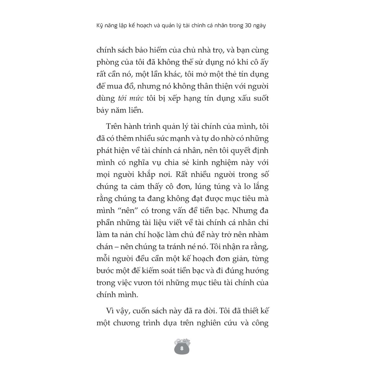 Bằng chương trình Thanh lọc Tài Chính trong 30 ngày, Kỹ năng lập kế hoạch và quản lý tài chính cá nhân trong 30 ngày giúp bạn định hình lại cách chi tiêu, thay đổi tư duy về tiền bạc và đảm bảo phương pháp quản lý tài chính cá nhân hiệu quả. Cuốn sách chính là cứu cánh cho mối quan hệ không mấy tốt đẹp của bạn với tiền bạc và giúp bạn vạch ra một kế hoạch chi tiêu để có thể vẫn vui vẻ mà không tốn kém. Lối tư duy tích cực và đúng đắn về tiền bạc mà tác giả đưa ra sẽ nhanh chóng hỗ trợ bạn hoàn thành các mục tiêu mà bạn mong muốn nhất trong đời.