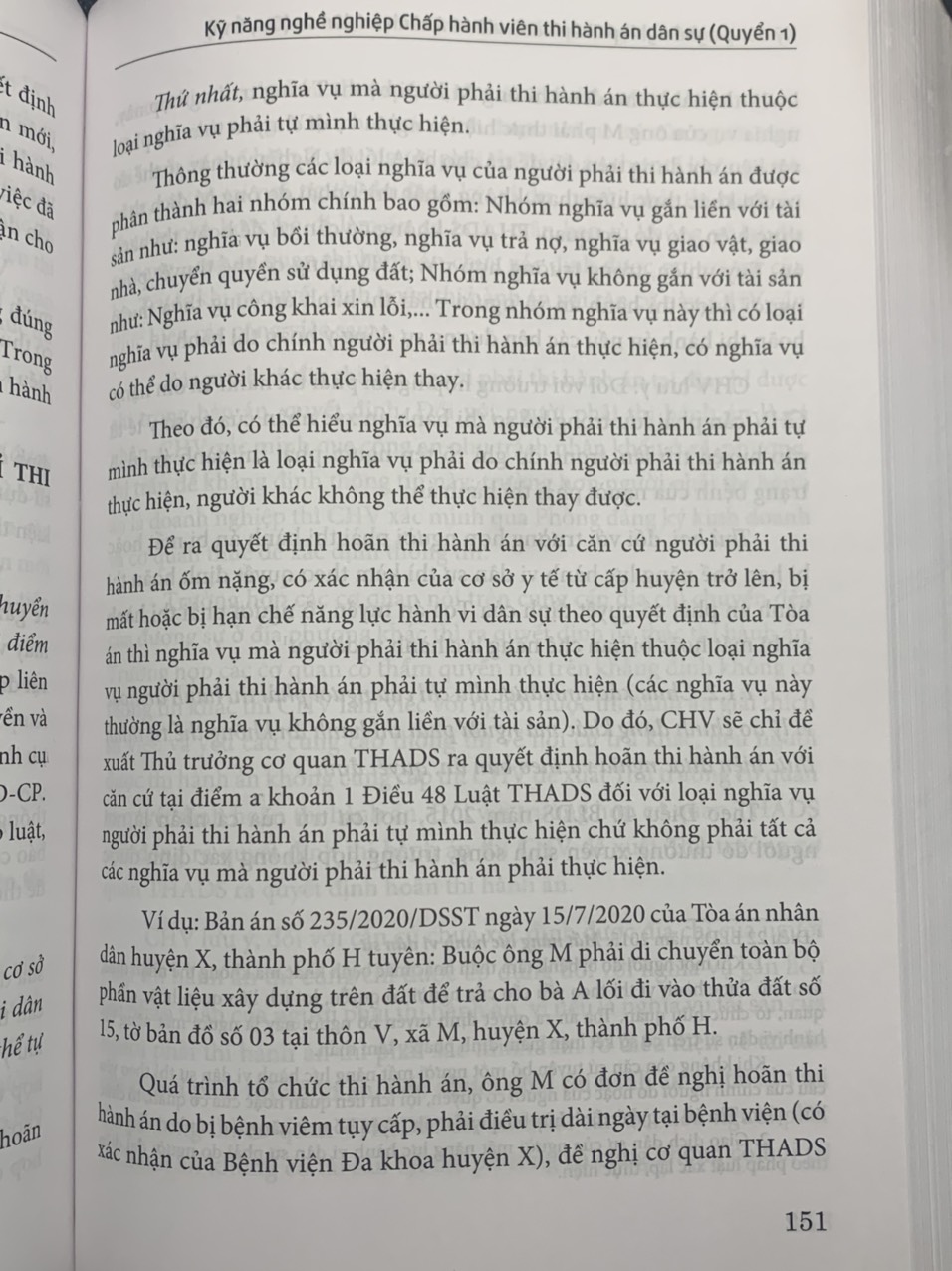 Nhà Xuất bản Tư pháp và Nhóm tác giả: Ths. GV.Hoàng Thị Thanh Hoa, Ths. Hồ Quân Chính, TS. Nguyễn Văn Nghĩa xin trân trọng giới thiệu tới Quý bạn đọc cuốn sách mới “Kỹ năng nghề nghiệp Chấp hành viên Thi hành án Dân sự” Đây là cuốn sách chứa đựng những kỹ năng quan trọng và thiết yếu có giá trị tham khảo và ứng dụng cao đối với Chấp hành viên Thi hành án Dân sự trong quá trình tổ chức thi hành án. Cuốn sách dày 600 trang, kết cấu được xây dựng bám theo thủ tục THADS trên cơ sở cập nhật tất cả các văn bản pháp luật về THADS và các lĩnh vực pháp luật khác có liên quan được áp dụng đối với từng thủ tục một cách chi tiết giúp người đọc dễ dàng tra cứu. Những giá trị quý báu mà cuốn sách mang đến cho bạn đọc: ứng với mỗi tác nghiệp của Chấp hành viên đều được chỉ rõ cơ sở pháp lý; thủ tục thi hành án được phân tích chặt chẽ trên cơ sở quy định của pháp luật; cùng với những điểm nhấn cần lưu ý khi áp dụng pháp luật và những kinh nghiệm thực tiễn vào việc tổ chức thi hành án; trang bị những “kỹ năng mềm” cần thiết trong quá trình tổ chức thi hành án. Bên cạnh ý nghĩa là một cuốn sách “kỹ năng nghề” của Chấp hành viên, cuốn sách còn có giá trị tham khảo đối với những người làm công việc chuyên ngành Tư pháp như Kiểm sát viên, Thẩm phán, Thừa phát lại… và các học viên chuyên ngành Luật cũng như đông đảo Quý độc giả. Nhóm tác giả hy vọng cuốn sách “Kỹ năng nghề nghiệp Chấp hành viên thi hành án dân sự” sẽ là người bạn đồng hành tin cậy đối với đồng nghiệp công tác trong hệ thống Thi hành án dân sự và đông đảo Quý bạn đọc quan tâm! Giá sách là 260.000 đồng/cuốn.