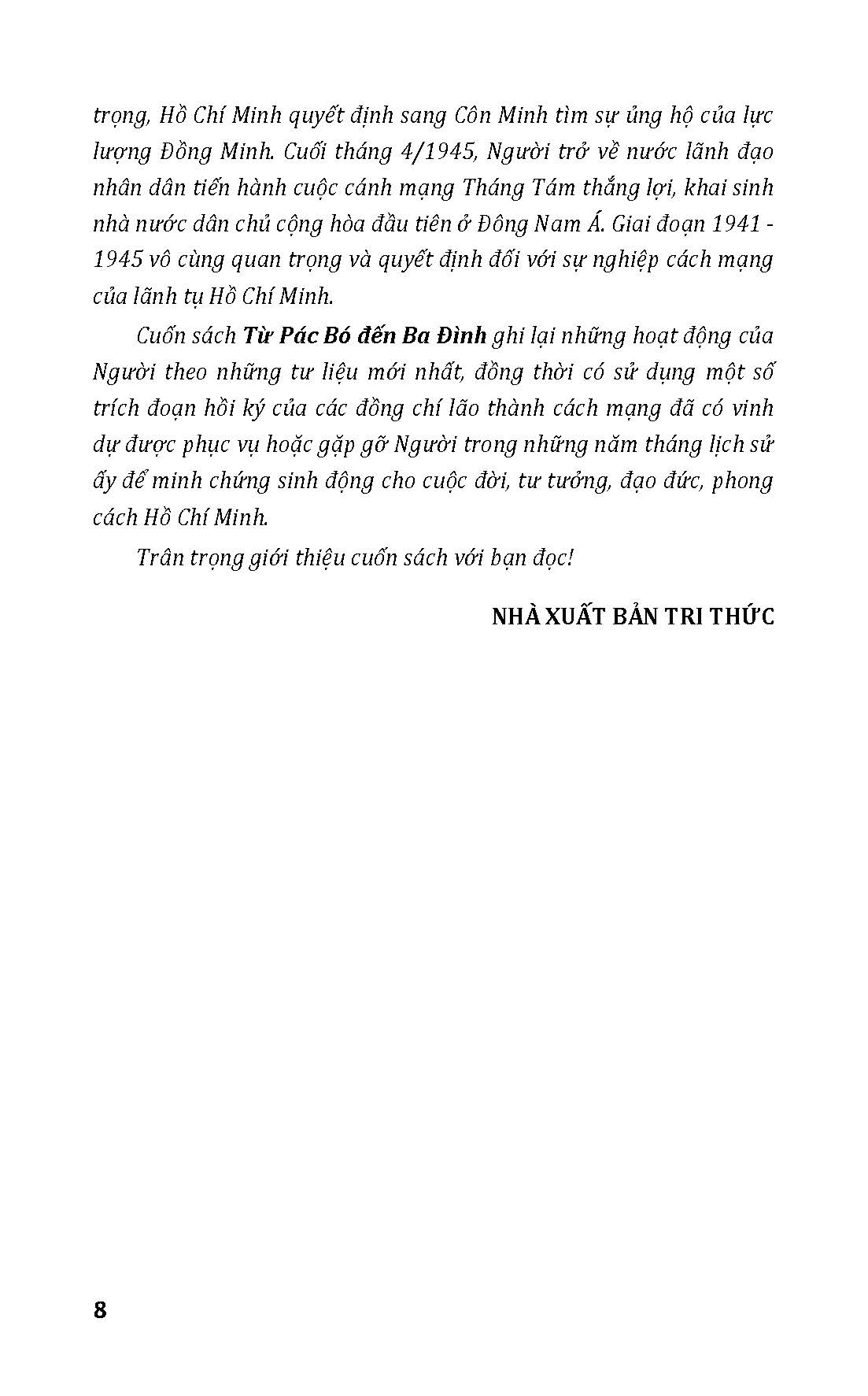 Cuốn sách "Hồ Chí Minh từ Pác Pó đến Ba Đình" đưa bạn đồng hành cùng Chủ tịch Hồ Chí Minh trong những năm tháng lịch sử hào hùng từ khi Người trở về nước lãnh đạo cách mạng đến ngày toàn quốc kháng chiến thắng lợi. Qua những trang sách, bạn sẽ được lắng nghe những câu chuyện chân thực từ chính những người đã từng sống, chiến đấu và làm việc cùng Bác, giúp bạn hiểu sâu sắc hơn về tư tưởng, đạo đức và phong cách của Chủ tịch Hồ Chí Minh.