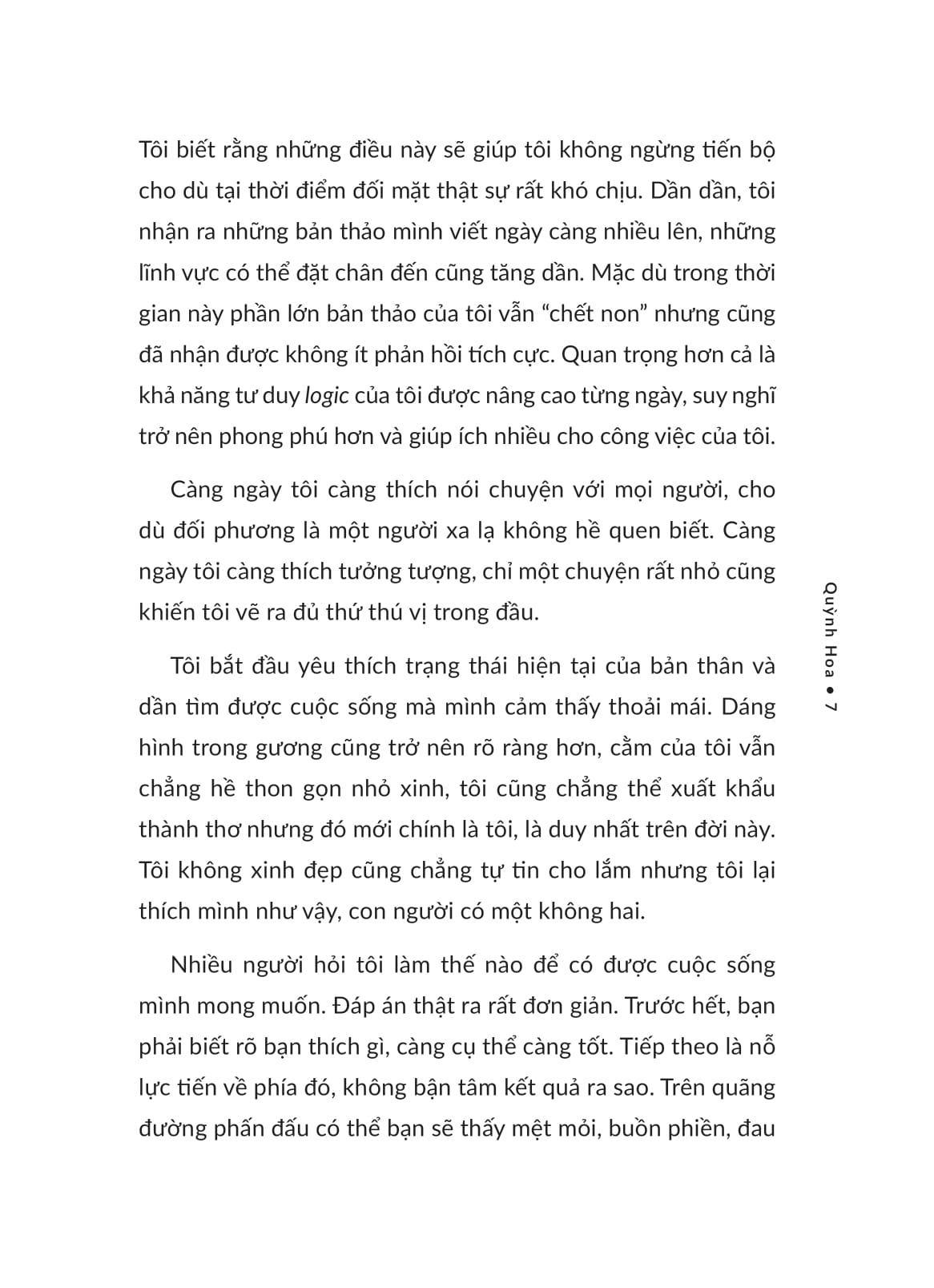 Sống Một Đời Theo Ước Nguyện Bản Thân Cuốn sách gồm có 5 chương chính: Chương 1: Dường như cô ấy đã đạt được tất cả mọi điều trong kế hoạch Chương 2: Đừng ung