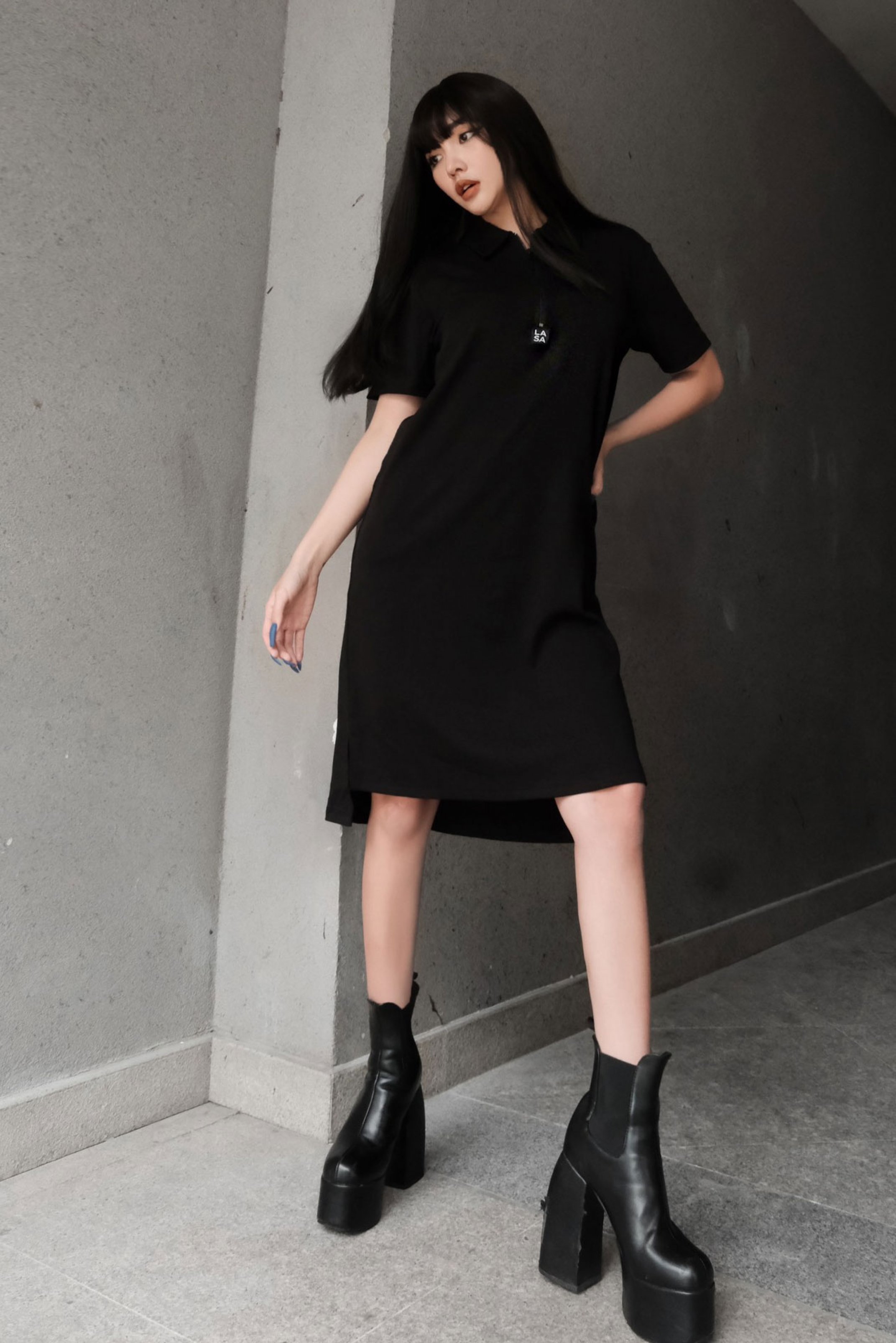 ✨LAAS Đầm suông cổ polo DK đen form rộng thoải mái năng động