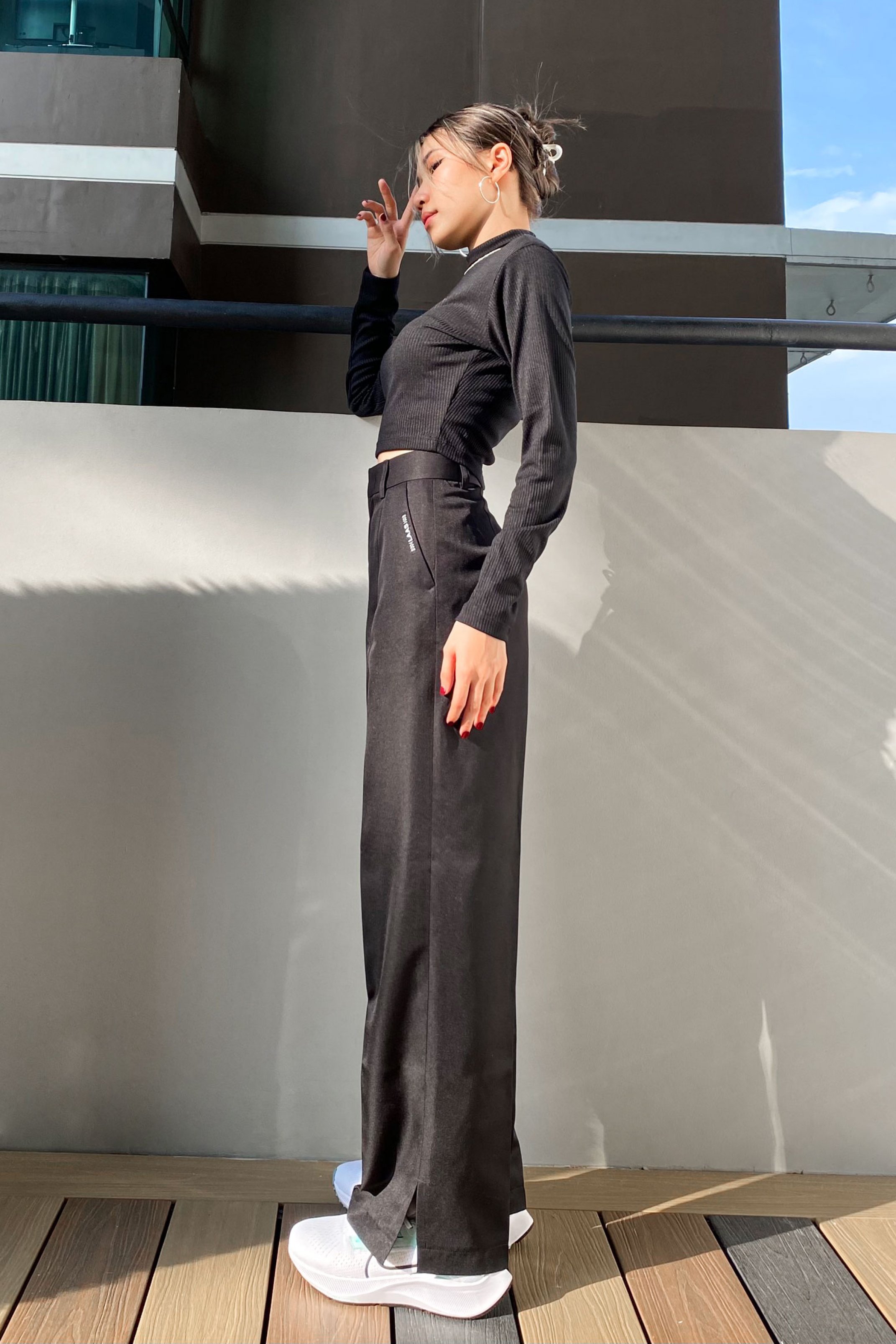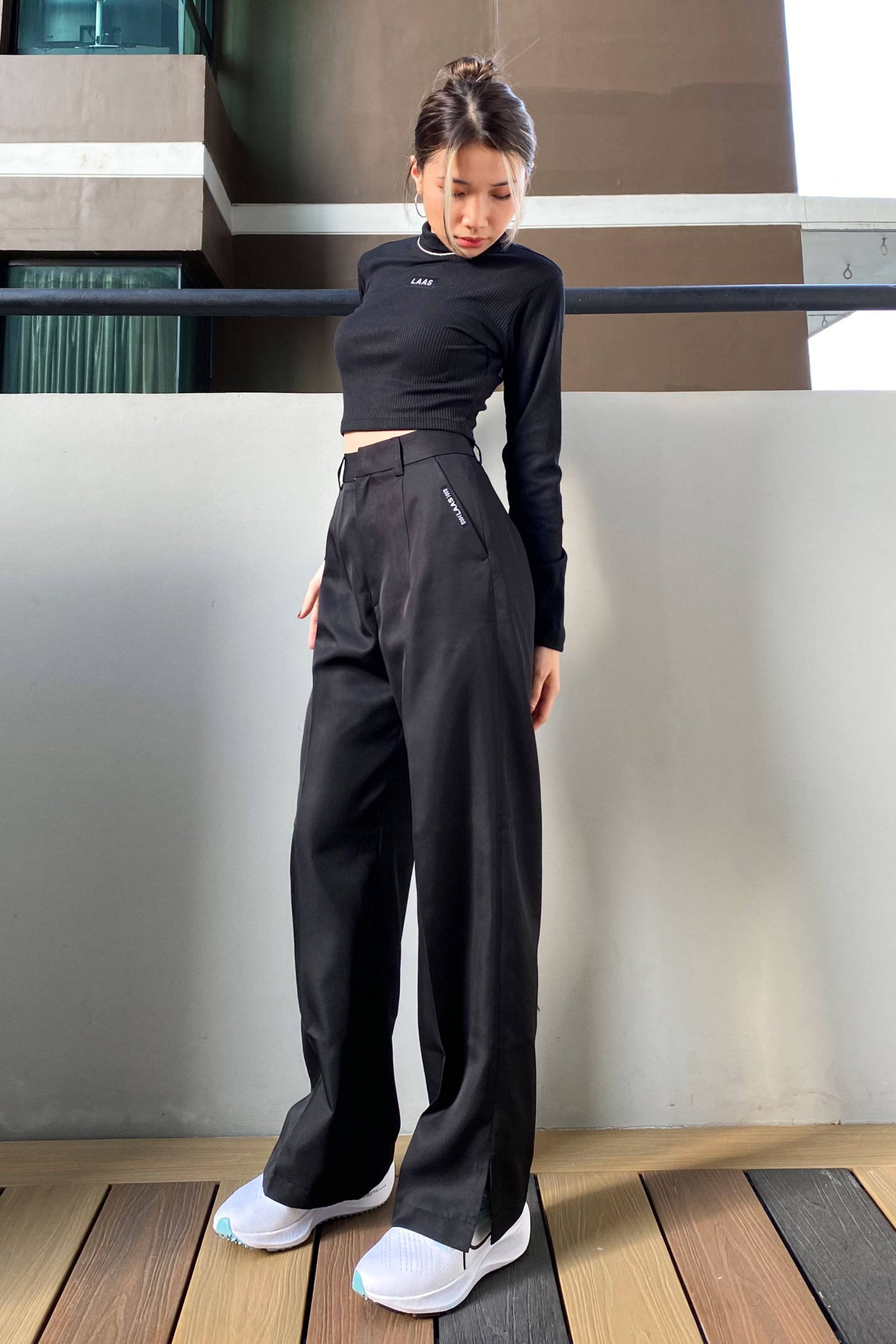 CHẤT LIỆU KAKI TÂY, DÀY DẶN ĐỨNG FORM QUẦN MÀU ĐEN FORM QUẦN ỐNG ĐỨNG, SUÔN THẲNG TẠO ĐÔI CHÂN DÀI PHẦN LAI QUẦN XẺ HAI BÊN TAG LOGO GẮN NGAY SƯỜN TÚI VÒNG EO