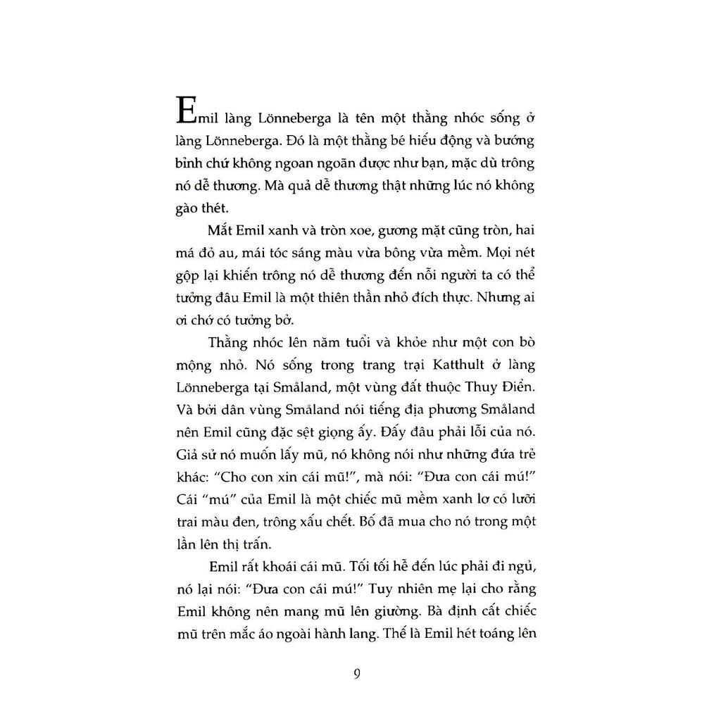 Và thế là, ở giữa nơi thấm đẫm sự bình yên tươi sáng của quê hương Astrid Lindgren, chẳng kém cạnh PippiT ất dài bằng món nghịch tối ngày đó, Emil trở thành một trong bộ đôi sứ giả văn chương được yêu mến nhất của nữ thánh văn học thiếu nhi Thụy Điển.
