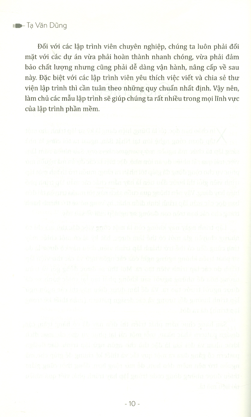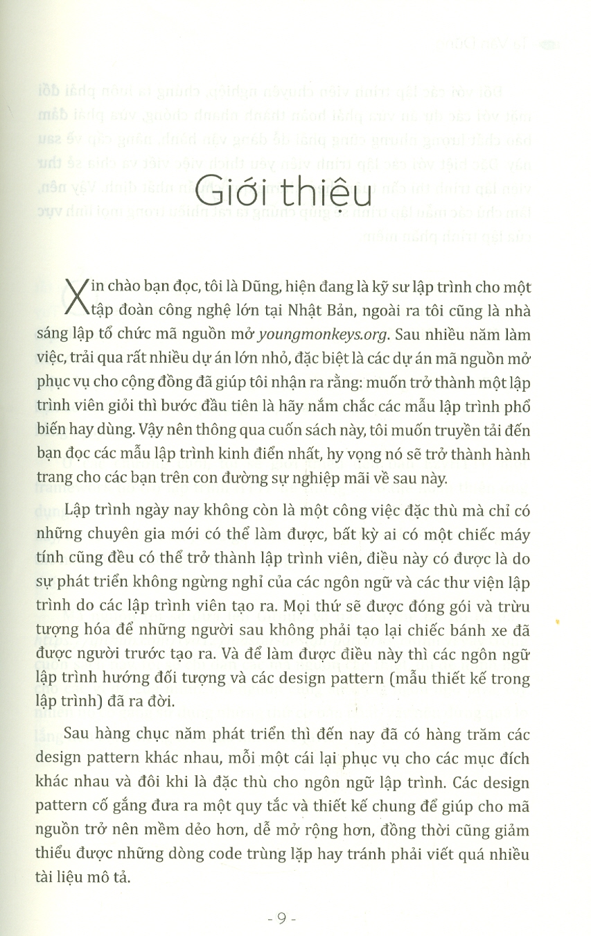 Tác giả Tạ Văn Dũng hiện đang là kỹ sư lập trình cho một tập đoàn công nghệ lớn tại Nhật Bản, đồng thời, anh còn là nhà sáng lập tổ chức mã nguồn mở Sau nhiều năm làm việc và trải qua nhiều dự án lớn nhỏ, đặc biệt là các dự án mã nguồn mở phục vụ cho cộng đồng, anh đã tổng kết kinh nghiệm trong cuốn Làm chủ các mẫu thiết kế kinh điển trong lập trình để truyền tải đến bạn đọc các mẫu lập trình kinh điển nhất. Hy vọng cuốn sách sẽ trở thành hành trang cho các bạn trên con đường sự nghiệp mãi về sau này.