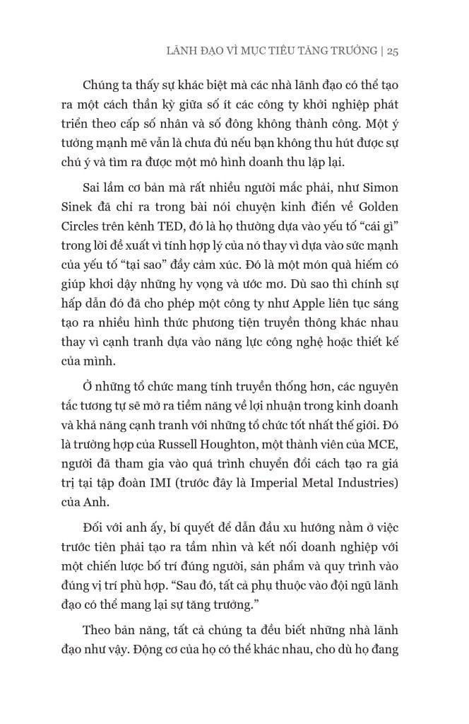 Ở mỗi chương, chúng ta sẽ nghe chia sẻ từ một công ty nổi tiếng về lý do tại sao các nhà lãnh đạo của họ lại chọn tập trung vào yếu tố đó. Họ sẽ giải thích cách họ lựa chọn và thực hiện, cách họ nhìn nhận vai trò lãnh đạo và ý nghĩa của lãnh đạo đối với tổ chức của họ.