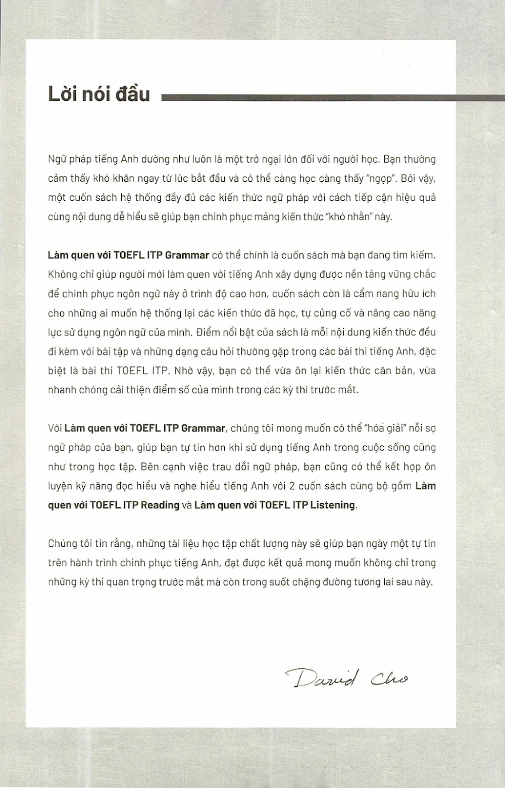 Làm Quen Với TOEFL ITP - Grammar Nhà xuất bản : Nhà Xuất Bản Thế Giới. Công ty phát hành : Alphabooks. Tác giả : David Cho. Kích thước : 16 x 24 cm. Số