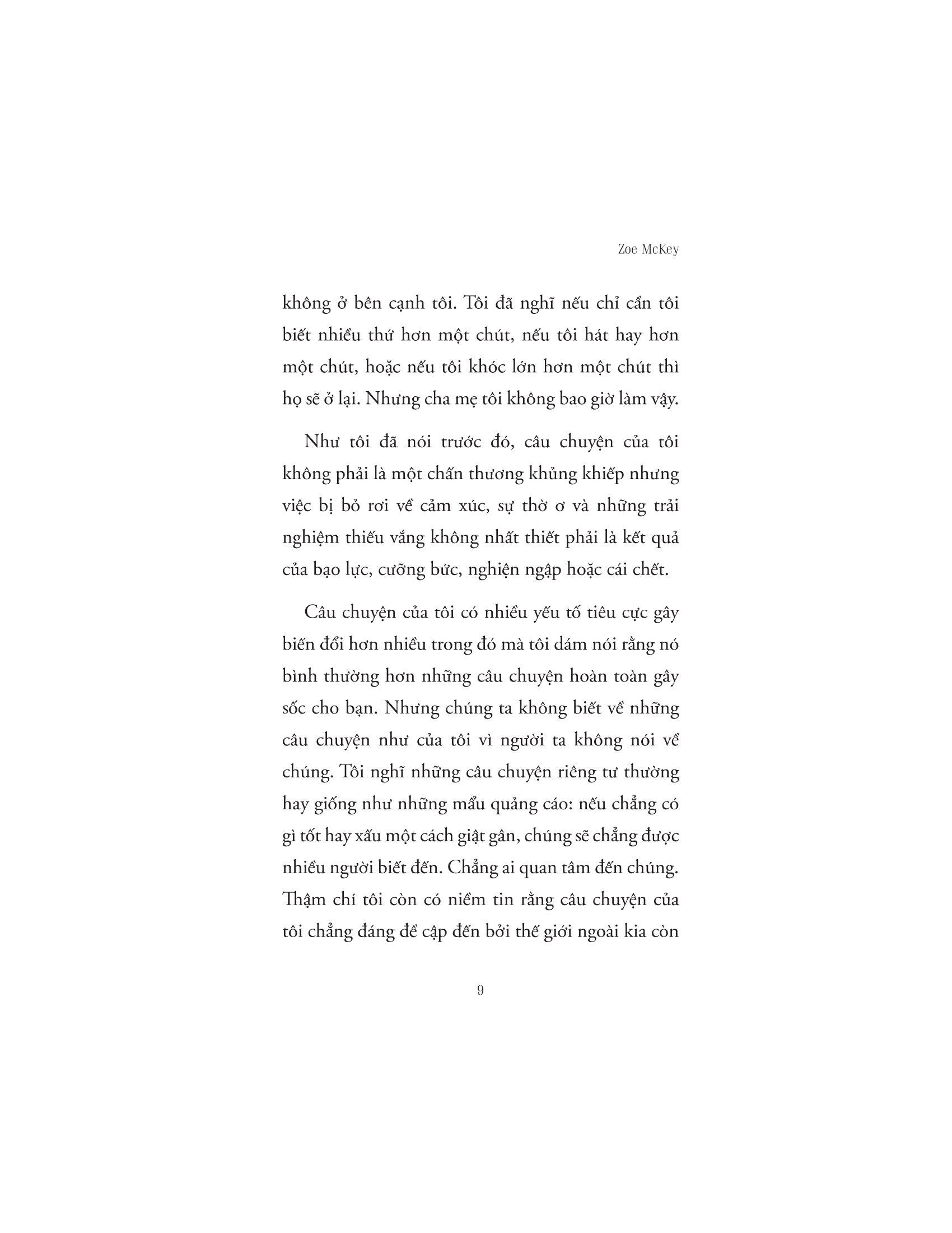 Trong thời gian vài năm trở lại đây, Zoe McKey bắt đầu viết lách, tập trung cho tình yêu cuộc sống và chia sẻ nó lại qua những cuốn sách. Những diễn giải của Zoe McKey trong sách sẽ giúp bạn đọc tìm ra được lý do để họ sống theo cách của riêng m.ình, luôn có một lời giải thích cho hành vi của bạn mà chính bạn cũng không nhận ra. Đọc sách Zoe McKey sẽ giúp bạn khai phá trí óc và hành động theo một cách mới để không ngừng tốt hơn trong cuộc sống.