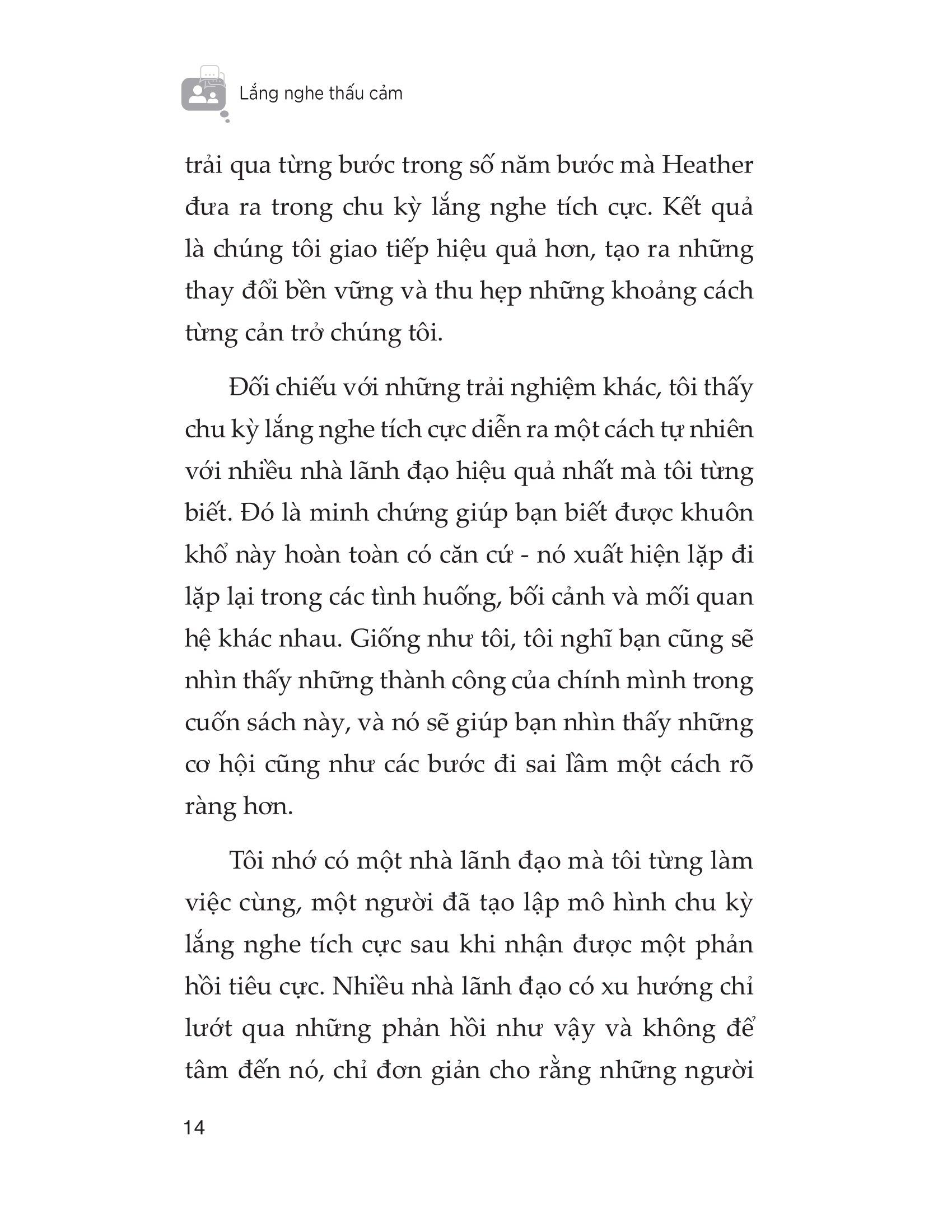 Với tất cả những ai đang gặp khó khăn về vấn đề giao tiếp, đặc biệt là giao tiếp tại nơi làm việc, Lắng nghe thấu cảm chính là giải pháp kịp thời và cực kỳ hiệu quả. Cuốn sách của tác giả Heather Younger, hệ thống hóa một quy trình lắng nghe tích cực gồm năm bước đề cao tính ứng dụng và hành động. Quy trình này không chỉ mở ra tiềm năng của toàn bộ đội nhóm và tổ chức, mà còn giúp chúng ta mang đến cho người khác bầu không khí tích cực về cảm xúc và tâm lý - tạo ra một không gian mà mọi người cảm thấy được lắng nghe, được trân trọng và được thấu hiểu một cách chân thành.