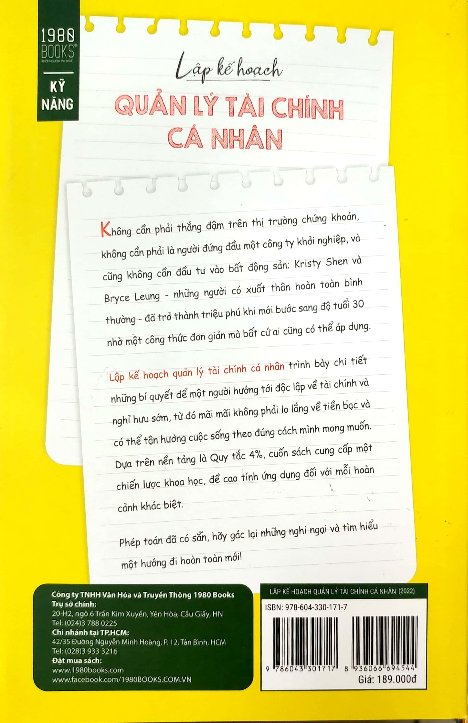 “Lập kế hoạch quản lý tài chính cá nhân”trình bày chi tiết những bí quyết để một người hướng tới độc lập về tài chính và nghỉ hưu sớm, từ đó mãi mãi không phải lo lắng về tiền bạc và có thể tận hưởng cuộc sống theo đúng cách mình mong muốn. Dựa trên nền tảng là Quy tắc 4%, sau đó kết hợp với Tư duy Khan hiếm, Đệm đỡ Tiền mặt và Khiên chắn Lợi suất, cuốn sách cung cấp một chiến lược khoa học, đề cao tính ứng dụng đối với mỗi hoàn cảnh khác biệt. Các biểu đồ cụ thể, những công thức rõ ràng và các ví dụ dễ hiểu có trong “Lập kế hoạch quản lý tài chính cá nhân” giúp tất cả mọi người đều có thể tiếp cận với giải pháp của Kristy và Bryce, đồng nghĩa với việc bạn hoàn toàn có thể lặp lại thành công của họ: tự do về tài chính, không còn phải làm công việc mình không yêu thích, nghỉ hưu khi còn trẻ và du lịch khắp nơi trên thế giới - trong khi giá trị tài sản vẫn không ngừng tăng lên nhờ đầu tư đúng cách.