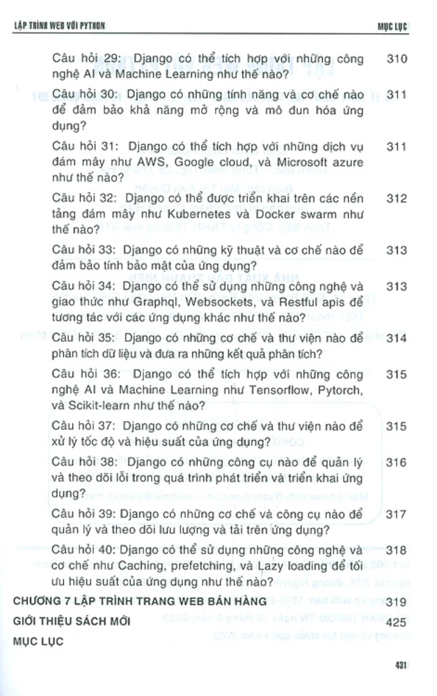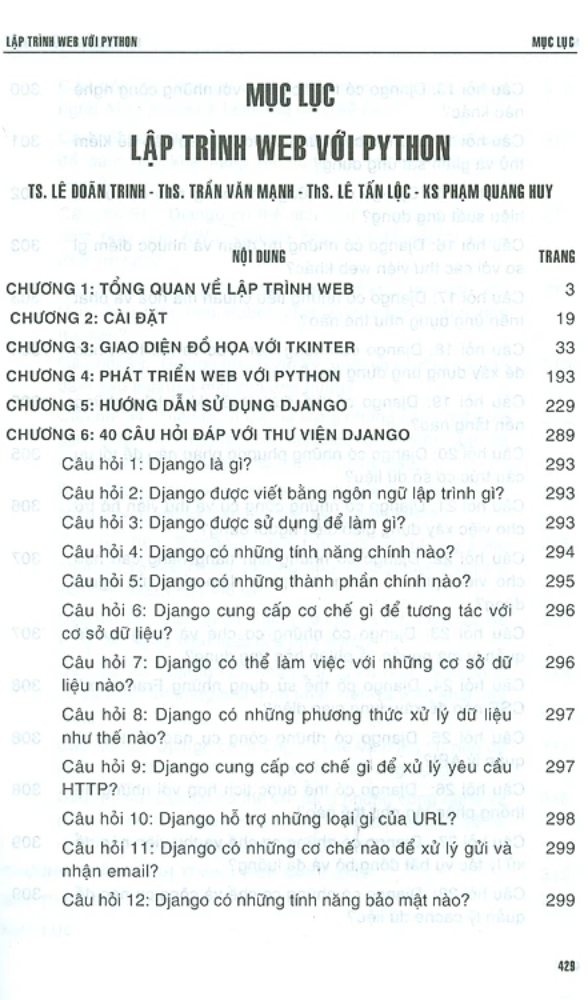 Lập Trình Web Với Python Nếu bạn là người lập trình viên chuyên nghiệp thì ngoài C, C++, C# thì Python là một trong những chương trình mà các bạn cần phải quan tâm vì rất nhiều ứng dụng cho AI, Machine Learning, Deep Learning, Chatbot, Khoa học dữ liệu, Dữ liệu lớn, Blockchain… hiện nay chủ yếu lập trình trên nền Python. Ngay cả hai ứng dụng chính mà trước đây được lập trình trên C hay C# như Lập trình Web (thương mại điện tử) và Lập trình Game theo các tác giả thì rất khó cho những người bắt đầu thì nay với Python sẽ dễ dàng hơn vì Python có rất nhiều thư viện hỗ trợ để lập trình (Chính các tác giả đã có nhiều kinh nghiệm lập trình trên C, C++, C# tới bây giờ vẫn còn sợ hay nói thẳng là rất ngại khi lập trình những bài tập lớn với C# vì lập trình C# quá khó). Viết code để lập trình web không chỉ đơn giản là một kiểm tra những kiến thức đã học vè Python mà đây còn là một lĩnh vực nghề nghiệp có nhu cầu rất lớn trên thế giới. Khi biết lập trình các trang web đơn giản, bạn có nền để làm việc trong nhiều lĩnh vực như khoa học, nghệ thuật, âm nhạc, thể thao, kinh doanh. Nếu thực hành thêm một chút nữa, bạn còn có thể viết ra một ứng dụng của riêng bạn, ví dụ như viết trò chơi (game) hoặc tùy chỉnh chương trình của một người nào đó theo ý muốn của bạn. Cuốn sách này giới thiệu đến bạn đọc ngôn ngữ Python, một trong những ngôn ngữ được sử dụng rộng rãi nhất trên thế giới. Phổ biến trong cả giới học sinh-sinh viên lẫn các chuyên gia, Python rất dễ sử dụng nhưng vẫn đầy mạnh mẽ và đa năng. Python là một ngôn ngữ tuyệt vời để học, dù bạn là người mới bắt đầu. Ngoài Python, trong chuyên đề này các tác giả chủ yếu giới thiệu hai thư viện chính trong thiết kế Web là Django và Tkinter được áp dụng triệt để trong lập trình thiết kế Web và nhiều ứng dụng khác nữa trong Khoa học dữ liệu. Trước khi hướng dẫn bạn đọc tìm hiểu sâu, khai thác và sử dụng hai chương trình này trong công thiết kế web tác giả sẽ dành hẳn ba chương để hướng dẫn bạn đọc làm quen với hai chương trình mới qua việc trình bày các câu hỏi và giải đáp giúp bạn đọc nhanh chóng có khái niệm tổng quan về hai chương trình này sau đó sẽ là các hướng dẫn chi tiết. Thư viện Flask cũng như Django, Tkinter va nhiều thư viện khác nữa sẽ được trình bày trong sách Python và ứng dụng-Lập trình Web. Nếu bạn không hiểu hết tất cả mọi chi tiết trong hướng dẫn thì cũng đừng lo lắng. Bạn càng thực hiện được các bài tập, xây dựng được nhiều dự án nhỏ với Python thì bạn sẽ hiểu rõ mọi thứ hơn về chương trình đầy quyền năng này. Ngoài ra, nếu chương trình của bạn không chạy ngay từ lần chạy đầu tiên thì cũng không nên chán nản. Ngay cả những người lập trình chuyên nghiệp nhất cũng phải thực hiện bước gỡ lỗi để chương trình có thể hoạt động như mong muốn. Khi đã hoàn thành việc làm các bài tập trong quyển sách sách, bạn sẽ có các mẹo về cách tinh chỉnh và điều chỉnh dự án này. Hãy thử chỉnh sửa theo cách của riêng bạn. Với một chút trí tưởng tượng và kỹ năng, sẽ không có giới hạn nào đối với một lập trình viên. Mặc dầu tên sách là Lập trình web với Python nhưng không phải ai cũng học được Lập trình web với Python. Các tác giả cho rằng, người đọc đã biết cách sử dụng máy tính rất cơ bản nhưng chưa có nhiều kinh nghiệm về lập trình. Mục đích của tác giả là hướng dẫn người đọc sử dụng ngôn ngữ Python để lập trình những yêu cầu cơ bản nhất về web mà một người lập trình viên cần phải có. Cuốn sách này không phải là sách “Hướng dẫn hoàn chỉnh về Lập trình web với Python. Trong thực tế, các bạn cũng như các tác giả có thể không đủ thời gian để biết mọi thứ về chủ đề này. Việc biết và sử dụng các công cụ và lệnh trong Python ít nhiều sẽ giúp bạn đọc khai thác có hiệu quả Python trong công việc. Một số ví dụ cho từng nội dung cụ thể sẽ được cung cấp trong sách, nhiều bài tập được giải thích rõ ràng, một số thì không. Đây là một cuốn sách hướng đến thực hành (60%). Có nhiều ví dụ và đoạn mã (code) dùng trong sách cũng như để bạn đọc tham khảo thêm khi thực hành. Bạn có thể tải về, chạy và chỉnh sửa code theo ý muốn từ một trong các đường dẫn sau: Trong quá trình biên soạn không thể tránh khỏi thiếu sót, chúng tôi mong được các bạn đọc góp ý, trao đổi để nội dung biên soạn ngày càng tốt hơn. Hy vọng các bạn sẽ nhanh chóng khai thác có hiệu quả Python trong công việc của mình.