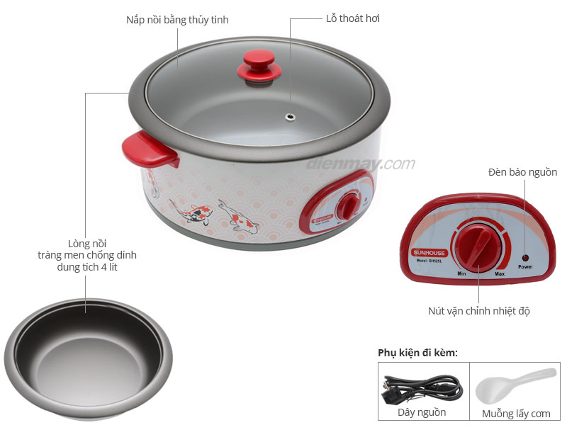 - Nồi Lẩu Điện SATO ST-351HP (3.5L) - Đỏ dùng để nấu lẩu, chiên, xào, rim và nấu canh, giúp bạn bổ sung nhiều món ngon vào thực đơn của gia đình. - Lòng nồi được làm từ nhôm