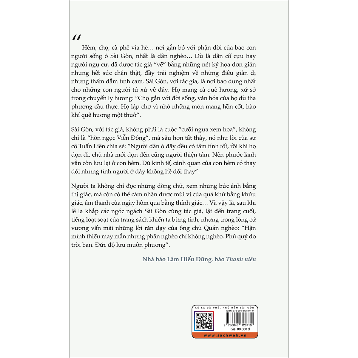 Người ta không chỉ đọc những dòng chữ, xem nhũng bức ảnh bằng thị giác, mà còn có thể cảm nhận được mùi vị của quá khứ bằng khứu giác, âm thanh của ngày hôm qua bằng thính giá Và vậy là, sau khi lê la khắp các ngóc ngách Sài Gòn cùng tác giả, lật đến trang cuối, tiếng loạt soạt của trang sách khiến ta bừng tỉnh, nhưng trong lòng cứ vương vấn mãi những lời răn dạy của ông chủ Quán nghèo: “Hận minh thiếu may mắn nhưng phận nghèo chí không nghèo. Phú quý do trời ban. Đức độ lưu muôn phương". Nhà báo Lâm Hiểu Dũng, báo Thanh niên