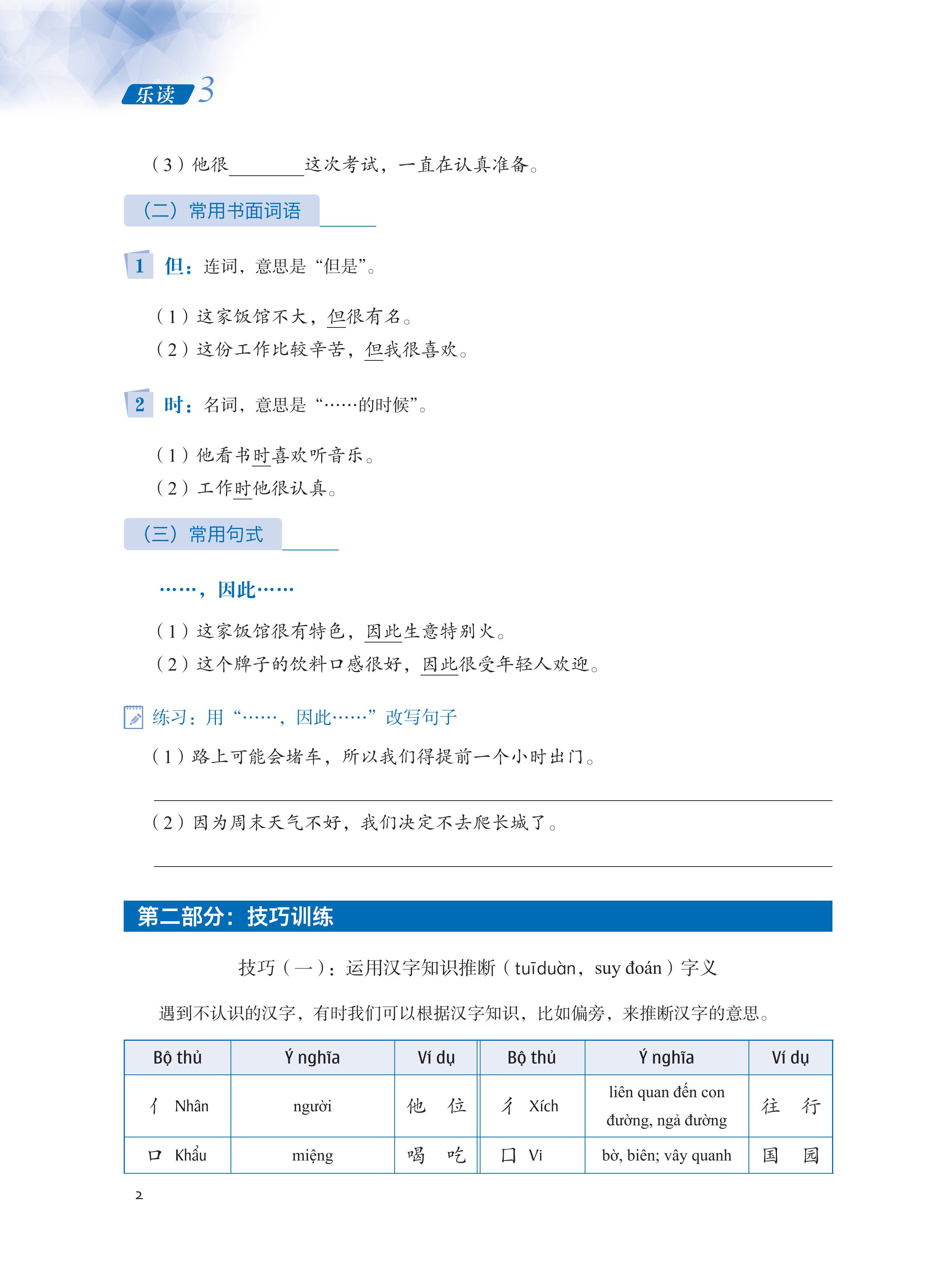 Phần 3: Thực tiễn đọc hiểu. Bao gồm ba phần lớn là đọc chuyên sâu, đọc mở rộng và đọc thực tế. Phần “Đọc chuyên sâu” và “Đọc mở rộng” bao gồm các nội dung như: học tập các từ vựng trọng tâm và từ vựng mở rộng thuộc các chủ đề thường gặp, bài tập khởi động, bài tập lý giải nội dung bài khóa, lý giải nghĩa câu và lý giải nghĩa từ, v.v., đồng thời trên cơ sở này hướng dẫn người học nắm được ý chính của bài khóa, vận dụng từ vựng trọng tâm thuộc chủ đề bài khóa để trình bày quan điểm, giới thiệu nội dung có liên quan một cách ngắn gọn. Phần “Đọc thực tế” bao gồm hai loại: Loại thứ nhất - “Đọc văn thuyết minh”, giúp người học tích lũy thường thức về lịch sử, văn hóa cần có đồng thời được tiếp xúc rộng rãi trong học tập và sinh hoạt thường ngày; loại thứ hai - “Tra tìm thông tin”, như tra tìm các thông tin du lịch, bảng giờ tàu xe, bảng các triều đại lịch sử, v.v., việc thiết kế nhiệm vụ nhấn mạnh tính ứng dụng, mục đích nhằm giúp người học giải quyết các vấn đề thường gặp trong học tập và sinh hoạt thường ngày.