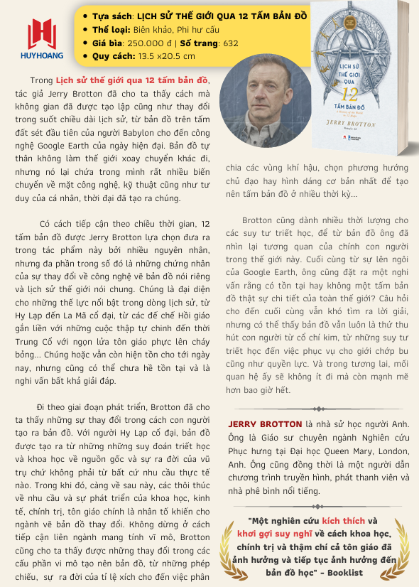 Xuyên suốt chiều dài lịch sử, bản đồ là nền tảng trong việc định hình quan điểm của chúng ta về thế giới và vị trí của ta trong thế giới đó. Không chỉ là những đối tượng khoa học thuần túy, bả.n đ.ồ th.ế giớ.i còn gắn bó mật thiết với hệ thống quyền lực tại thời điểm và địa điểm cụ thể. Trong cuốn sách thú vị này, Jerry Brotton xem xét tầm quan trọng của 12 tấm bản đồ – từ những bản đồ thời cổ đại đầy huyền bí tới bản đồ hình ảnh vệ tinh chuẩn xác hiện nay. Ông đã tái hiện sống động môi trường và hoàn cảnh mà mỗi tấm bản đồ được tạo ra, từ đó cho thấy cách thức mỗi tấm bản đồ phản ánh và truyền tải một góc nhiền rất riêng về thế giới, để từ đó chúng ta hiểu rõ hơn về thời đại đã khai sinh ra nó.