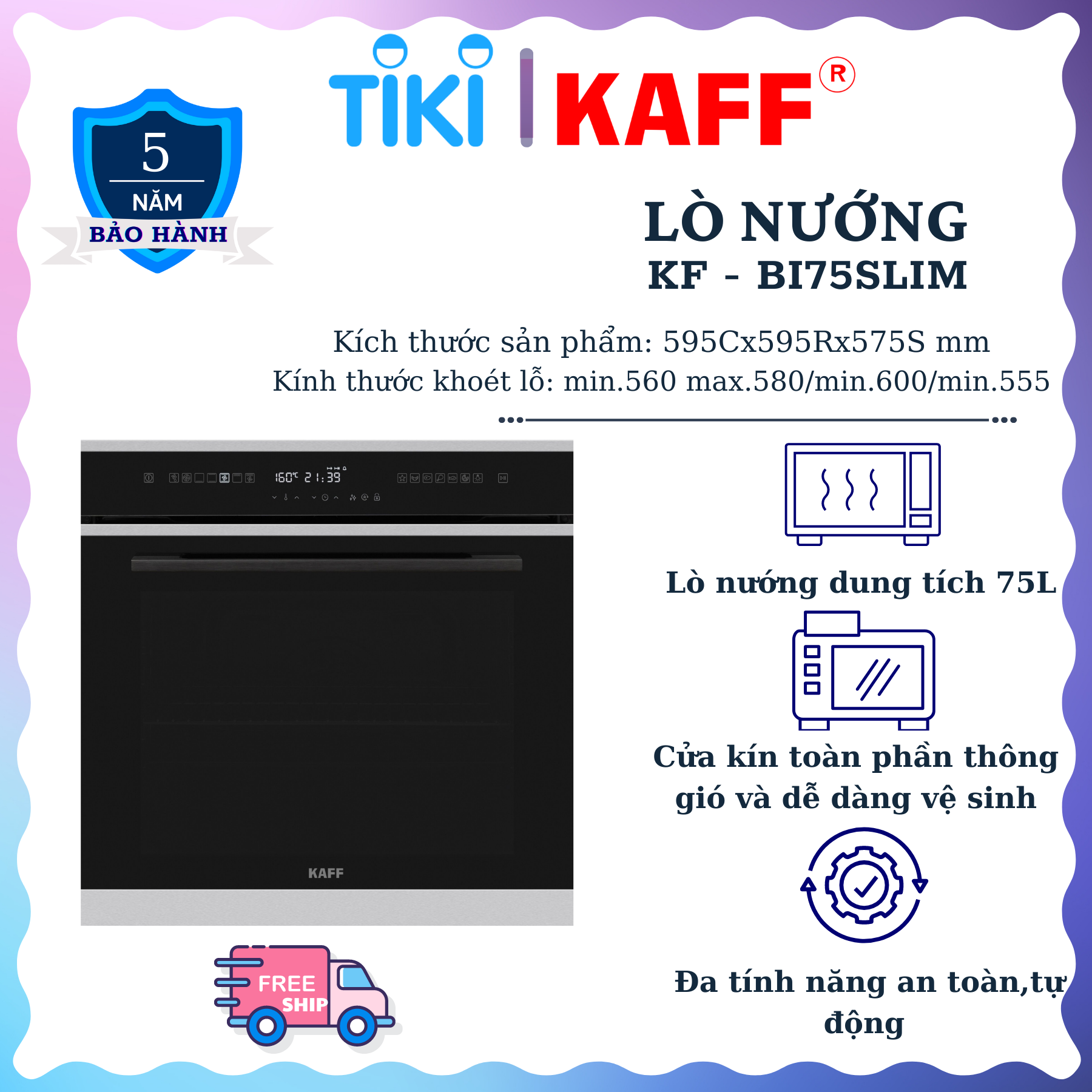 Mua tại TiktokLò nướng đối lưu lắp âm tủ KAFF KF-BI75SLIM Thế Hệ Mới 2022 được nhập khẩu nguyên chiếc từ Thổ Nhỉ Kỳ được thiết kế âm tủ, chỉ để hở ra mặt trước, toàn bộ phần khoang lắp chìm vào tủ bếp. Thiết kế này không chỉ giúp căn bếp gọn gàng mà còn luôn giữ cho nhiệt độ lò ổn định trong khi hoạt động, không bị xô dịch hay tác động bên ngoài. Mặt kính đen phủ bên ngoài, viền thép chắc chắn bao quanh, kính trong 3 lớp cách nhiệt có thể nhìn được bên trong giúp bạn quan sát dễ dàng quá trình nướng. Ở lò nướng đối lưu lắp âm tủ KF-BI75SLIM này bạn sẽ tìm thấy ba yếu tố nổi bật nhất của sản phẩm này là: Thiết kế hiện đại, hiệu suất đun nấu cao và an toàn tuyệt đối. Thông số kỹ thuật: