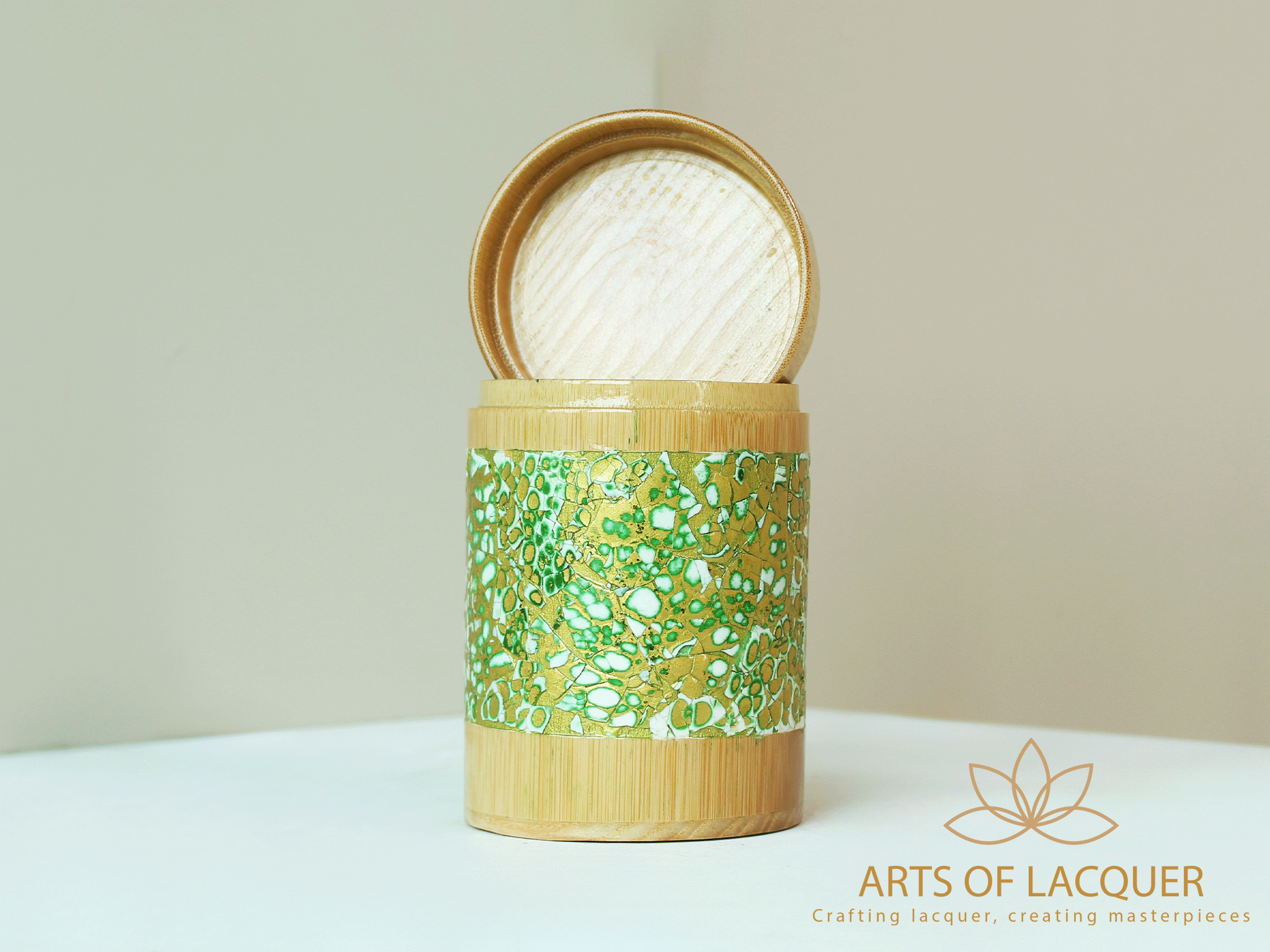 Sản phẩm trong hình là "Lọ Tre Sơn Mài Xanh Lá Cây" từ Arts of Lacquer. Hộp có thiết kế tròn với nền màu vàng nhạt và vảy xanh lá cây, được trang trí bằng