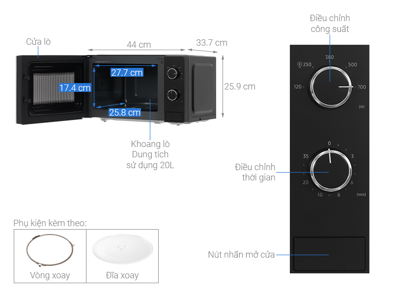 [THÔNG SỐ KỸ THUẬT] Dung lượng: 20L (0.7 Cu.ft) Tiêu thụ điện (Lò vi sóng): 1050 W Kích thước bên ngoài (RxCxS): 440 x 259 x 337.5 mm   Thiết kế Màu sắc: Đen