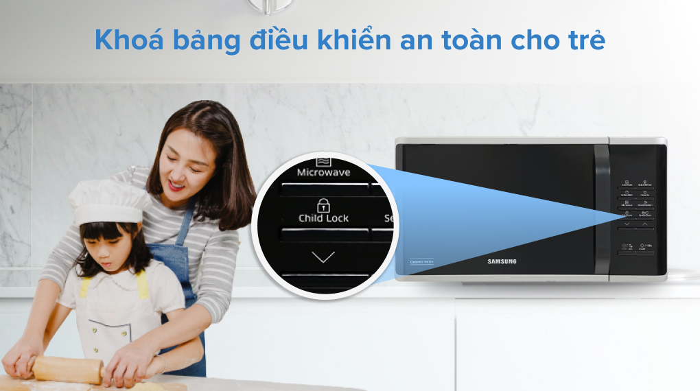 Lò vi sóng Samsung thiết kế hiện đại, màu sắc và kiểu dáng sang trọng, nổi bật trong không gian bếp sử dụng Lò vi sóng dung tích 23 lít phù hợp cho nhu cầu sử dụng nấu