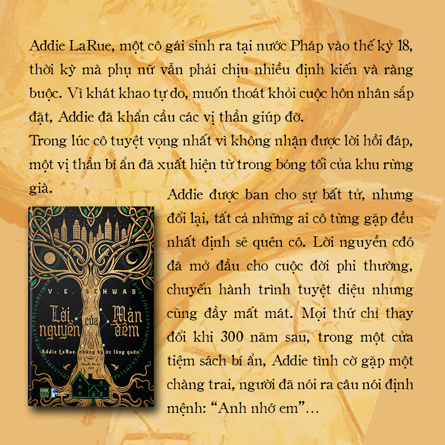 Trong lúc cô tuyệt vọng nhất vì không nhận được lời hồi đáp, một vị thần bí ẩn đã xuất hiện từ trong bóng tối của khu rừng già. Addie được ban cho sự bất tử, nhưng đổi lại, tất cả những ai cô từng gặp đều nhất định sẽ quên cô. Lời nguyền chết chóc đó đã mở đầu cho cuộc đời phi thường, chuyến hành trình tuyệt diệu nhưng cũng đầy mất mát, đau thương và mỏi mệt của Addie LaRue. Cô đã sống qua nhiều thế kỷ, đi xuyên các lục địa, trải qua mọi thăng trầm của lịch sử và nghệ thuật, từ từ khám phá giới hạn của bản thân, xem mình phải đi bao xa mới để lại được dấu ấn trên cuộc đời này.