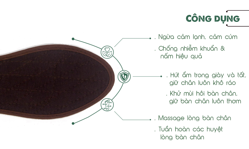 CÔNG DỤNG CỦA LÓT GIÀY QUẾ VẢI COTTON CI-03 Được làm từ nguyên liệu Quế Trà My nên có rất nhiều công dụng như: - Diệt nấm, vi khuẩn tồn tại trong giày.