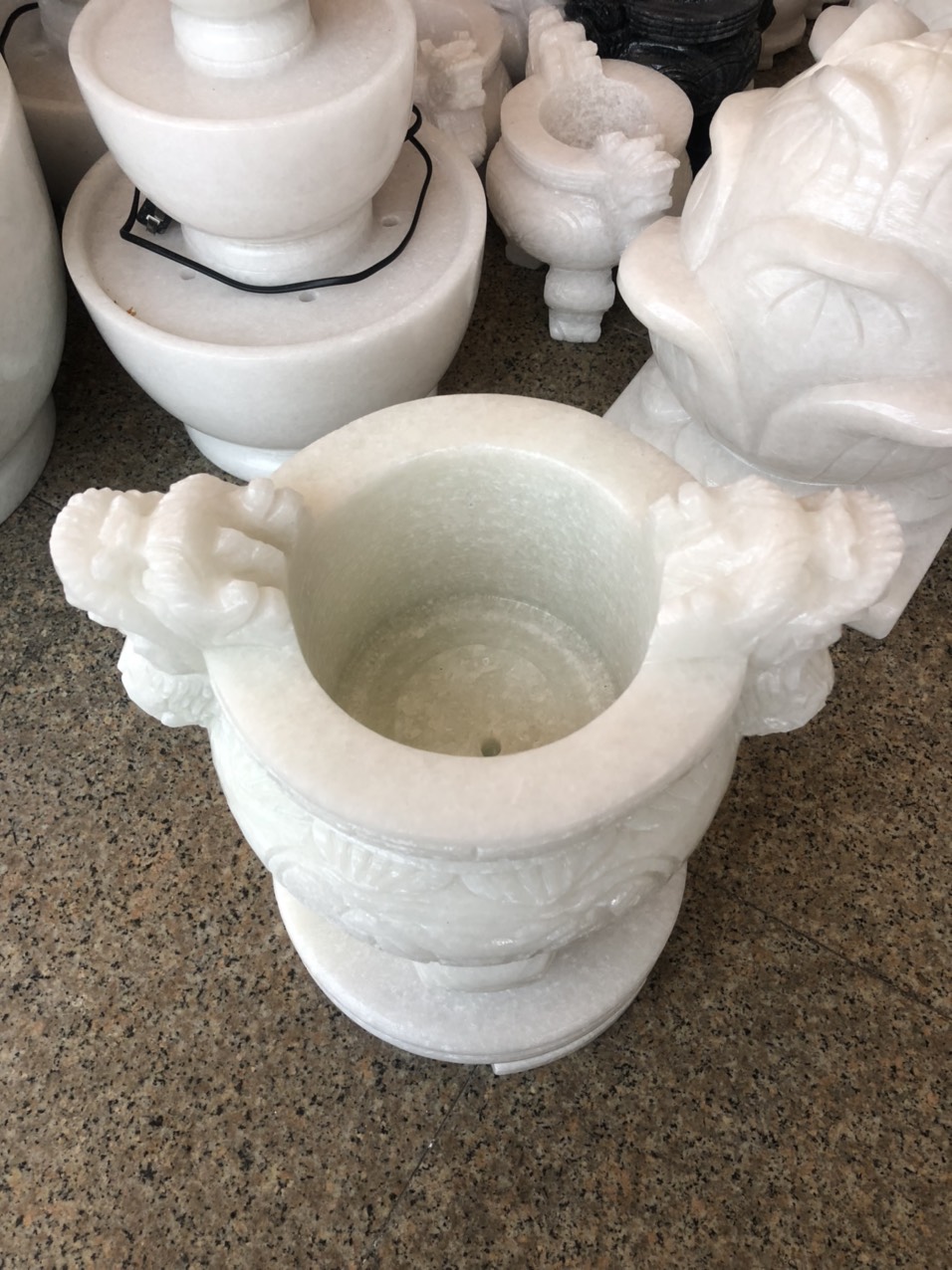 Kích thước: Cao 20cm; Đường kính miệng 13cm; Ngang 20cm Khối lượng: 5 kg Chất liệu: Đá cẩm thạch trắng
