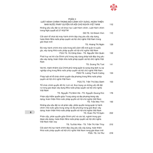 Mua tại TiktokCuốn sách Luật Hành chính Việt Nam: Từ truyền thống đến Nhà nước pháp quyền xã hội chủ nghĩa do PGS.TS. Vũ Công Giao, PGS.TS. Nguyễn Quốc Sửu, PGS.TS. Đặng Minh Tuấn (Đồng chủ biên) góp phần đáp ứng yêu cầu đó. Cuốn sách được chia thành hai phần: Phần 1 gồm một số bài viết đề cập sự phát triển của Luật Hành chính, khoa học Luật Hành chính Việt Nam từ trước tới nay, bao gồm một số vấn đề lý luận, thực tiễn đang đặt ra với sự phát triển của ngành luật này. Phần 2 gồm những bài viết đề cập nhiều nội dung của Luật Hành chính mà cần cải cách, hoàn thiện để thực hiện các mục tiêu, nhiệm vụ có liên quan trong Nghị quyết số 27-NQ/TW.