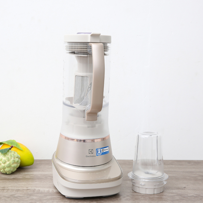 Máy xay sinh tố Electrolux sang trọng trong màu trắng bạc với viền vàng đồng và cối trong suốt, thiết kế hiện đại nổi bật ở mọi góc nhìn Cối xay chất liệu nhựa Tritan cao cấp, trong suốt