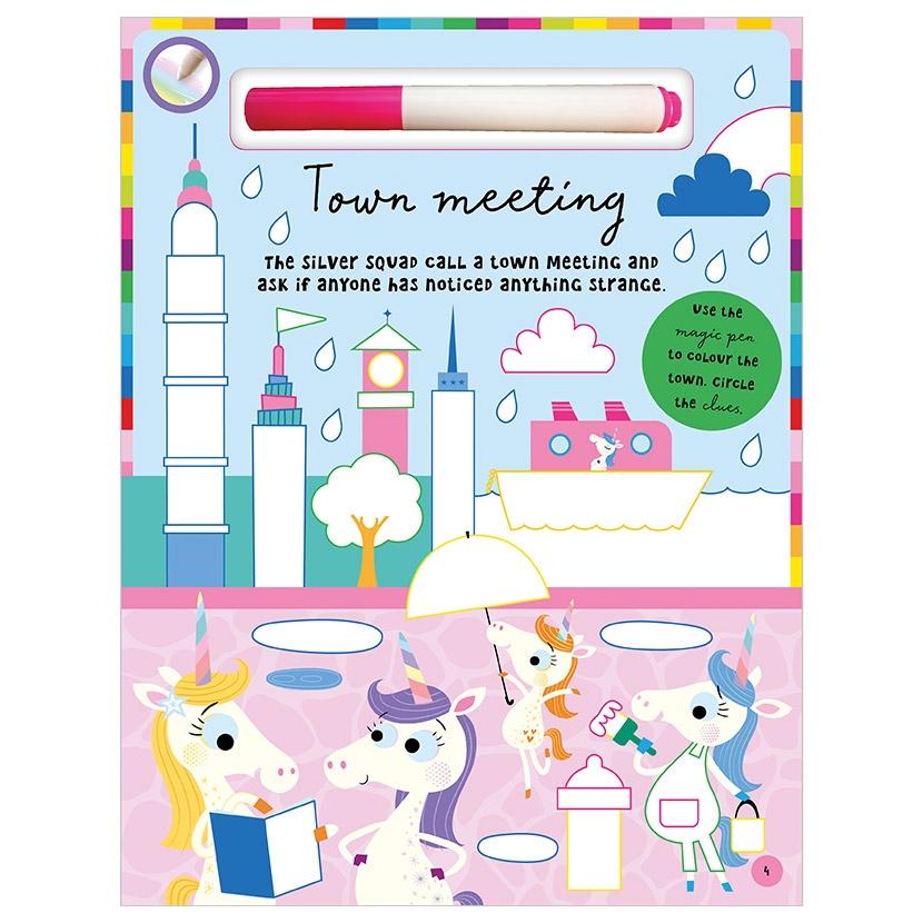 Use the magic pen to reveal hidden ink on the pages. Solve the clues, search for hidden symbols and crack the codes to help the unicorn squad solve the mystery.