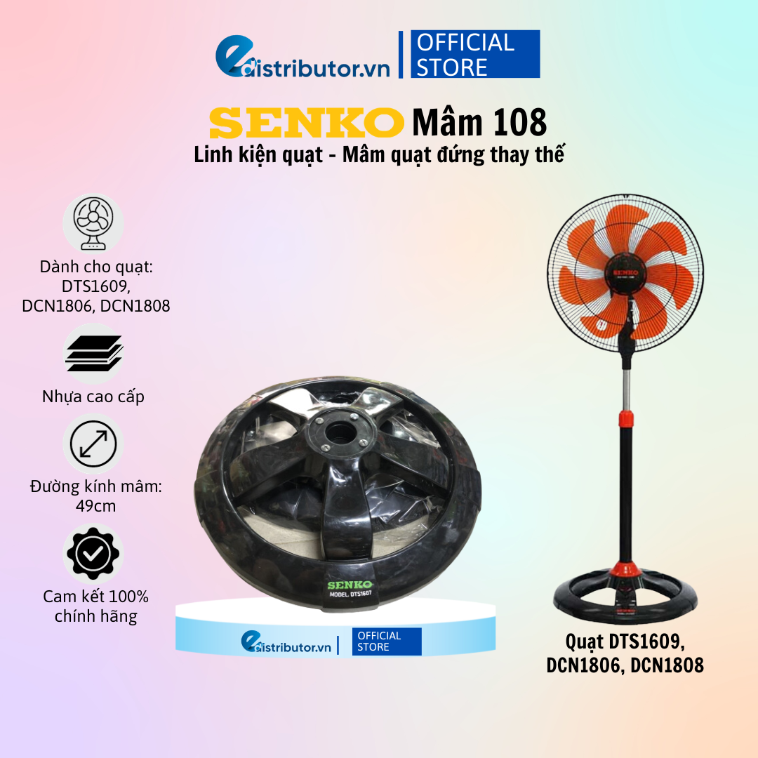 Mua tại TiktokMâm quạt thay thế cho quạt đứng Senko - 100% chính hãng - Thương hiệu: Senko - Sản xuất: Việt Nam MÂM QUẠT 106 - Đường kính mâm: 40cm - Dùng cho quạt: LTS1636, LTS1632 - Chất liệu: nhựa cao cấp - Màu sắc: đen MÂM QUẠT 107 - Đường kính mâm: 45cm - Dùng cho quạt: DTS1607 - Chất liệu: nhựa cao cấp - Màu sắc: đen MÂM QUẠT 108 - Đường kính mâm: 49cm - Dùng cho quạt: DTS1609, DCN1806, DCN1808 - Chất liệu: nhựa cao cấp - Màu sắc: đen