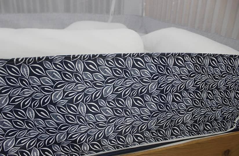 • Đáy màn chụp được may cẩn thận, chần kỹ, sắc cạnh. Kết hợp với 4 góc chun cài vào nệm và khung thép vững chắc, giúp bảo vệ em bé không bị lăn khỏi giường giúp mẹ yên tâm để bé nằm ngủ một mình.