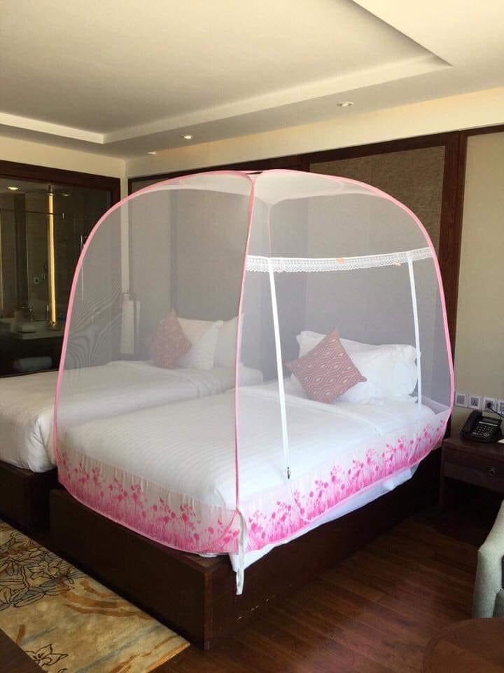 MÀN CHỤP , MÙNG CHỤP CAO CẤP MỘC MIÊN ĐỈNH RỘNG : Màn chụp tự bung cao cấp Mộc Miên đỉnh rộng trắng viền hồng loại 1,6m x2m - 3 cửa : Xuất xứ :