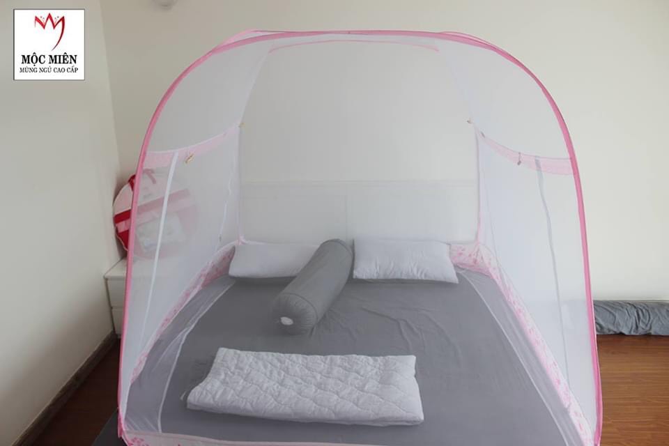 MÀN CHỤP , MÙNG CHỤP CAO CẤP MỘC MIÊN ĐỈNH RỘNG : Màn chụp tự bung cao cấp Mộc Miên đỉnh rộng trắng viền hồng loại 1,6m x2m - 3 cửa : Xuất xứ :