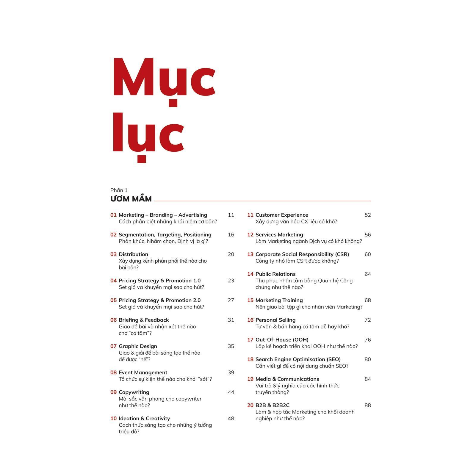 - Lời khuyên dễ hiểu và dễ áp dụng Tác giả không chỉ chia sẻ các khái niệm và kiến thức phức tạp mà còn cung cấp những cách tiếp cận và giải pháp rất cụ thể và thực tế. Các bài học như cách quản lý kênh phân phối, cách xây dựng chiến lược định giá, hay việc tổ chức sự kiện đều được trình bày bằng những câu chuyện và ví dụ dễ hiểu. Đây là một cuốn sách ""hướng dẫn hành động"", giúp người đọc từ mức cơ bản có thể áp dụng ngay vào công việc hàng ngày mà không phải mất nhiều thời gian tìm hiểu thêm.
