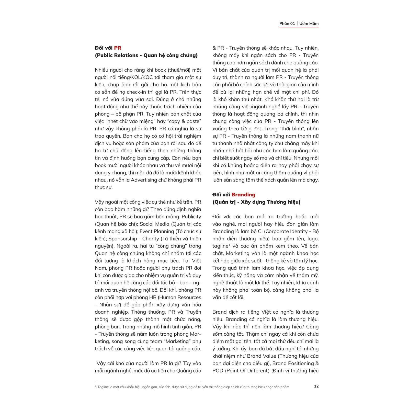 Phong cách viết gần gũi và truyền cảm hứng Cuốn sách không chỉ cung cấp thông tin mà còn truyền cảm hứng mạnh mẽ cho người đọc, đặc biệt là các bạn trẻ mới vào nghề. Phong cách viết của tác giả gần gũi, lôi cuốn và có phần hài hước, giúp người đọc không cảm thấy nặng nề khi tiếp cận với những kiến thức chuyên môn. Cảm giác như bạn đang được trò chuyện và học hỏi từ một người đi trước giàu kinh nghiệm. Cuốn sách truyền tải thông điệp rằng dù công việc marketing có khó khăn, người đọc vẫn có thể vượt qua và thành công nếu họ biết cách áp dụng những bài học đúng đắn. Lý do đáng mua cuốn sách: ● Đây là cẩm nang dành cho người làm marketing tại Việt Nam, với những bài học thực chiến và ứng dụng cao. ● Kiến thức đa dạng, toàn diện và dễ áp dụng vào công việc hàng ngày của các marketer, từ phân khúc thị trường, chiến lược định giá, đến tổ chức sự kiện và quản lý thương hiệu. ● Phong cách viết gần gũi, dễ hiểu, và đầy cảm hứng giúp cuốn sách không chỉ là một tài liệu học tập mà còn là một nguồn động lực cho người đọc. ● Đặc biệt phù hợp cho người mới bắt đầu hoặc đang tìm kiếm cách cải thiện kỹ năng trong ngành marketing. Với những yếu tố này, ""Marketique: Marketing Có Ích"" không chỉ là cuốn sách để đọc mà còn là một công cụ cần thiết cho bất kỳ ai muốn thành công trong ngành marketing tại Việt Nam. CÁC TRÍCH ĐOẠN HAY ● ""Đừng nhầm lẫn giữa Price (Giá cả) và Pricing (Chính sách giá). Giá cả là cố định, nhưng chính sách giá có thể thay đổi để phù hợp với đối tượng và thời điểm."" ● ""Trong marketing, hãy luôn nghĩ tới 'Get WHO to do WHAT by HOW' - cách đơn giản nhất để định hình một chiến lược truyền thông hiệu quả."" ● ""Mỗi một nền tảng sẽ có những đặc thù và hiệu quả khác nhau. Việc chọn đúng kênh Media & Communications là chìa khóa dẫn đến thành công."" ● ""Nếu như tháng nào bạn cũng khuyến mại, tức là chẳng lúc nào bạn có khuyến mại."" ● ""Làm Branding là 'chơi đùa' với cảm xúc và tâm lý, và không có một ý tưởng sáng tạo nào phù hợp cho 100% số đông."" ĐÁNH GIÁ CỦA BTV VỀ CUỐN SÁCH Đây là 1 cuốn sách hay, chứa đựng nhiều thông tin bao quát về marketing và cách để giúp người mới hoặc đã làm marketing biết cách làm việc hiệu quả hơn. Tư duy của tác giả rất sáng rõ, thông minh, cộng thêm phong cách hài hước nên cuốn sách này thực sự đáng đọc cho không chỉ dân marketing mà còn cho những người “ngoại đạo” muốn hiểu về marketing. Cuốn sách mang tính ứng dụng cao, phù hợp với thị trường Việt Nam, đồng thời cung cấp cái nhìn bao quát về marketing từ khâu xây dựng thương hiệu, phân khúc khách hàng đến quản lý các kênh truyền thông.
