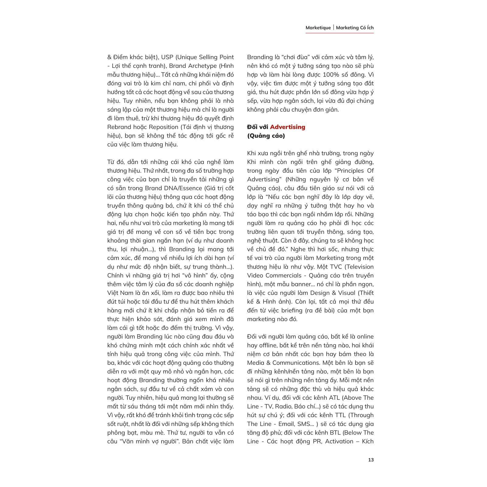 - Các nhà quản lý thương hiệu, nhân viên quảng cáo và các agency quảng cáo. TÓM TẮT SÁCH Cuốn sách ""Marketique: Marketing Có Ích"" chia sẻ 50 bài học quan trọng về marketing, tập trung vào trải nghiệm thực tiễn tại thị trường Việt Nam. Sách được viết dưới dạng nhật ký trưởng thành của một người làm marketing, giúp người đọc nhận diện rõ ràng các khái niệm như branding, quảng cáo, phân khúc khách hàng, định giá, và tổ chức sự kiện. Nó cũng nhấn mạnh tầm quan trọng của việc xây dựng chiến lược marketing, quản lý kênh phân phối, và các kỹ năng liên quan đến quan hệ công chúng (PR). Mỗi bài học đều được viết dựa trên kinh nghiệm thực tiễn, cung cấp các công cụ và cách tiếp cận phù hợp cho những người mới bắt đầu sự nghiệp hoặc muốn nâng cao kỹ năng trong ngành này. CUỐN SÁCH CÓ GÌ ĐẶC BIỆT