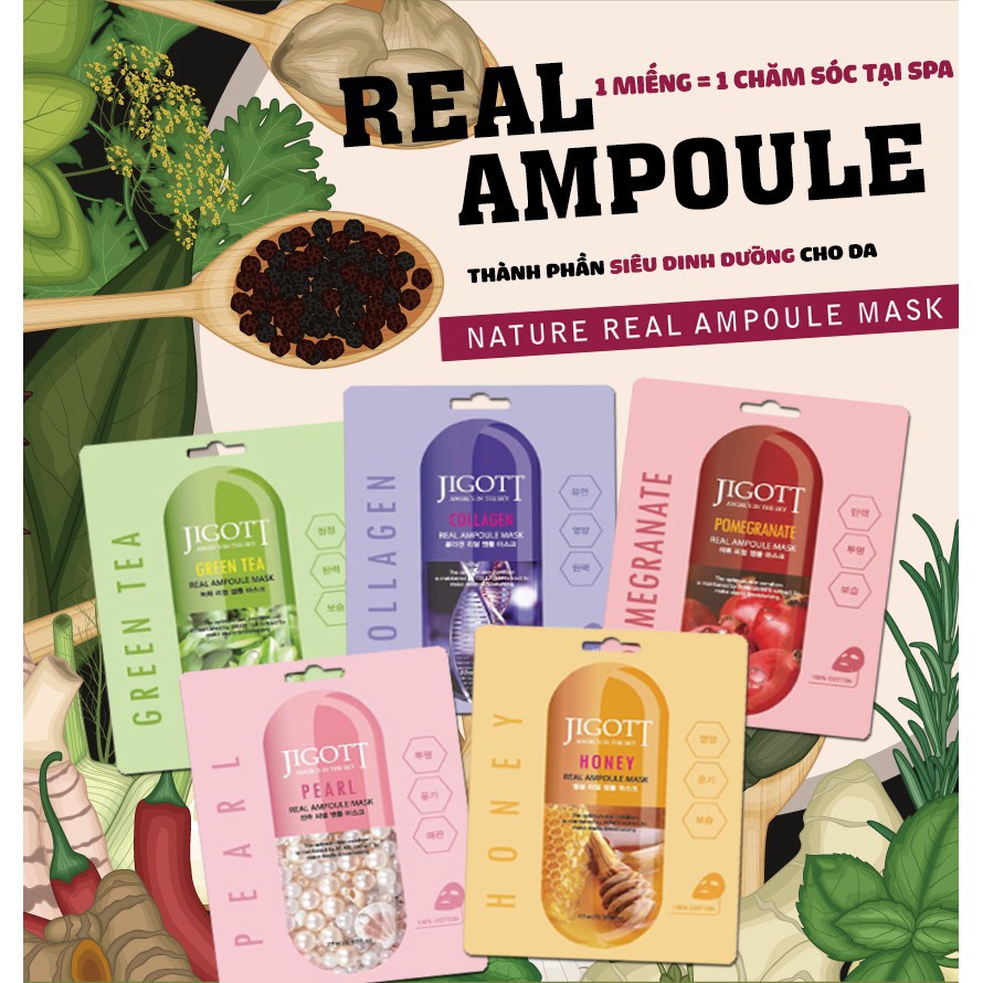 - Mặt nạ trà xanh Jigott Green Tea Real Ampoule Mask: Trà xanh là nguyên liệu không thể bỏ qua. Ngoài hợp chất giàu chất chống oxy hóa giúp làm trẻ và đẹp da, trà xanh còn giúp kháng khuẩn, ngăn ngừa mụn và làm sáng da. Mặt nạ này còn giúp điều tiết cân bằng hoạt động của tuyến nhờn trên da, làm sạch da và ngừa mụn đấy. Bởi rinh em này về là da vừa trẻ vừa đẹp lại vừa khỏe luôn ấy.