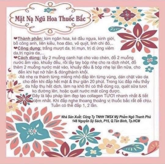 Mặt nạ ngũ hoa Dr Cell THÀNH PHẦN: kim ngân hoa, ké đầu ngựa, kinh giới, bồ công anh, linh kiều, hoa đào, vỏ quýt, linh chi đỏ... CÔNG DỤNG: Làm mát da, hút đi mủ trong mụn. Kiểm soát lượng dầu Làm mờ vết thâm nám, tàn nhang, Giúp da mặt căng bóng, trắng sáng, hết mụn nhọt, mụn cám trứng cá và mẩn ngứa do dị ứng. Sau khi đắp mặt nạ, cảm nhận đầu tiên là rất mát, da căng, mướt… Sau đó vùng da được chăm sóc trắng mịn lên. Lỗ chân lông được thu nhỏ lại giúp làn da trở nên mềm mại. CÁCH DÙNG: Pha với sữa tươi không đường hoặc nước ấm Lấy hai thìa cafe bột nạ ngũ hoa cho vào chén, cho thêm 5 muỗng nước lọc vào khuấy đều lấy tay bóp nhẹ cho ra hạt nở ra. Bóp nhẹ thấy mềm dẻo và kết dính là được. Xé nhẹ ra từng miếng nhỏ đắp lên từng vùng và dàn đều ra cho đến khi đắp hết mặt và thư giãn 20 phút. Trong lúc đắp nếu thấy da hấp thụ hết dịch làm mặt nạ khô thì có thể dùng cọ quét sữa tươi không đường lên hoặc quét nước mát cũng được. Đây là liệu pháp làm đẹp tạo Collagen TƯƠI cho da nhanh nhất và tiết kiệm nhất. Khi đắp nghe thoang thoảng vị thuốc bắc rất dễ chịu. Tuần có thể đắp 1-2 lần 1 gói đắp hơn 10 lần