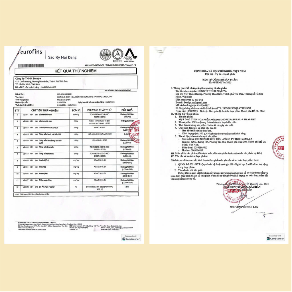 Mật ong Rừng Nhiệt Đới và Honimore là 2 thương hiệu thuộc sở hữu của Công ty TNHH Zemlya, với hơn 40 năm kinh nghiệm trong sản xuất mật ong. Các sản phẩm thuộc 2 thương hiệu này hiện đã có mặt ở tất cả các hệ thống siêu thị lớn của Việt Nam và nước ngoài. -------------------------------------------------------------------------- I. THÔNG TIN SẢN PHẨM - Tên sản phẩm: Mật ong Chanh - Thương hiệu: Rừng Nhiệt Đới - Khu vực khai thác: Các cánh rừng ở khắp 3 miền - Thành phần: 93% mật ong chín và 7% bột chanh - Nhà sản xuất: Công ty TNHH Zemlya (129/3 đường 154, phường Tân Phú, Thành phố Thủ Đức, Tp.HCM) - Quy cách đóng gói: chai thủy tinh - Khối lượng: 360g/chai - Hạn sử dụng: 2 năm kể từ ngày sản xuất - Chứng nhận Vệ sinh an toàn thực phẩm số 2857/2023/BQLATTPHCM do Ban quản lí An toàn thực phẩm TPHCM cấp ngày 18/07/2023 - Giấy kiểm nghiệm số AR-23-VD-065594-01 được cấp bởi Eurofins II. ĐẶC ĐIỂM NỔI BẬT Mật ong chanh là sản phẩm tiện lợi 2 trong 1, là sự kết hợp tinh túy