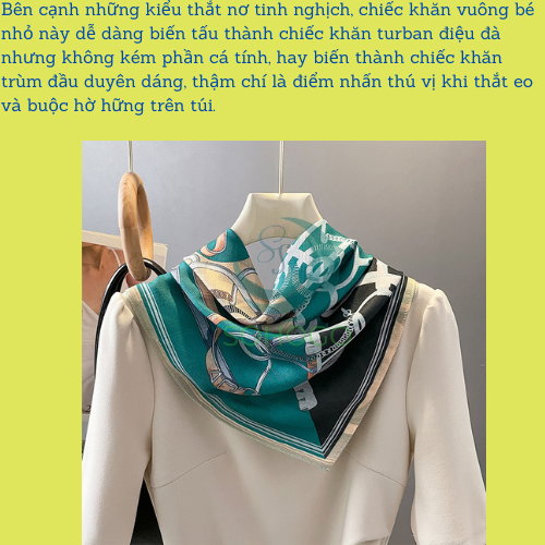Bên cạnh những kiểu thắt nơ tinh nghịch, chiếc khăn vuông bé nhỏ này dễ dàng biến tấu thành chiếc khăn turban điệu đà nhưng không kém phần cá tính, hay biến thành chiếc khăn trùm đầu duyên dáng, thậm chí là điểm nhấn thú vị khi thắt eo và buộc hờ hững trên túi.
