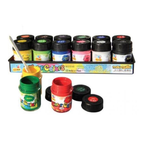 Màu Nước TL WACO-05 (12 Màu) Dạng màu nước được đựng trong lọ nhựa dung tích 15ml trong suốt nhận diện được màu bên trong và tem nhận diện màu trên nắp lọ. Có roan
