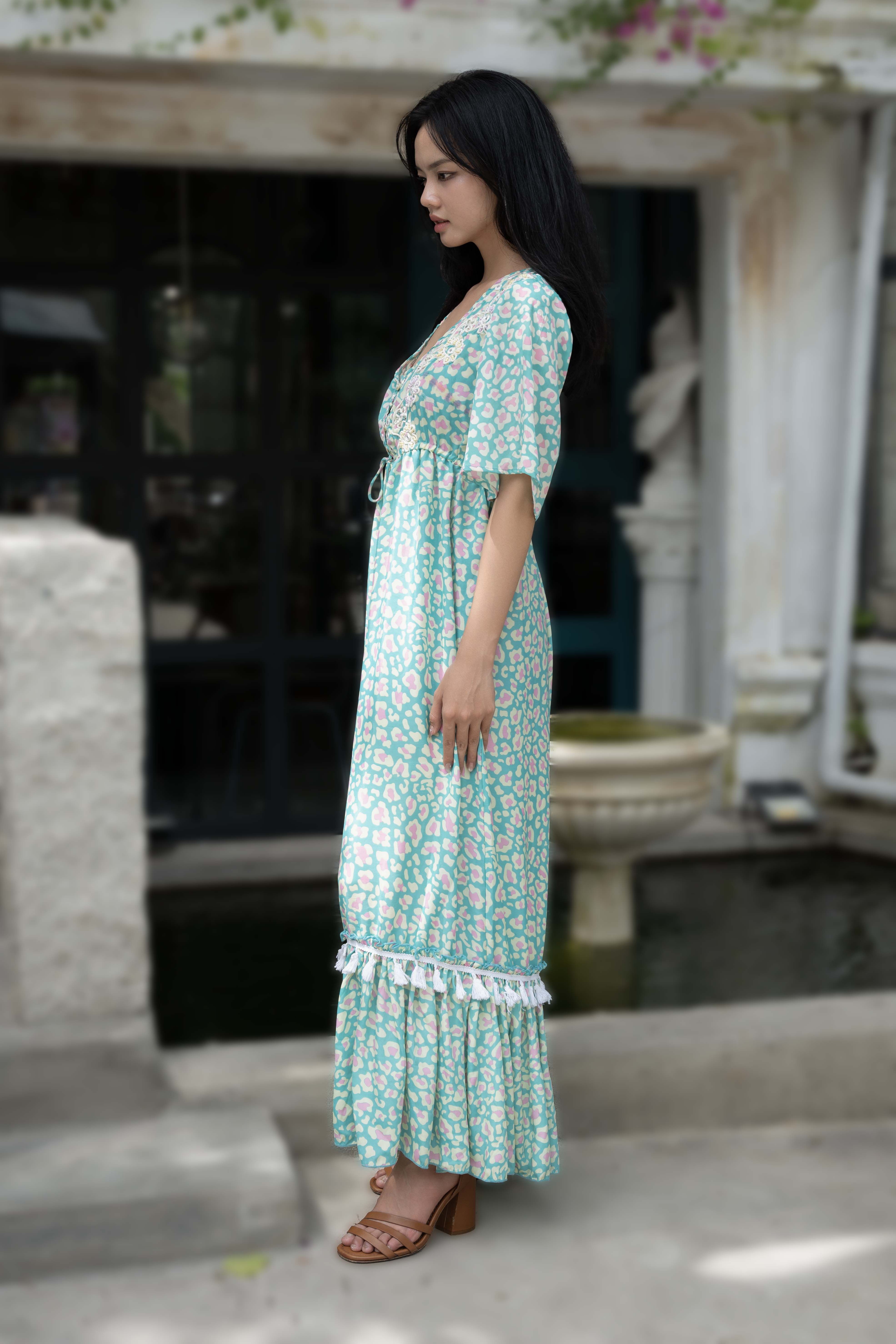 Maxi Hoa Phối Ren Ánh Bạc Cotton Isla Bonita chất liệu cotton cao cấp, mềm mại. Nổi bật phần cổ áo phối ren kết ánh bạc, nơ tua rua màu hồng nữ tính. Họa tiết