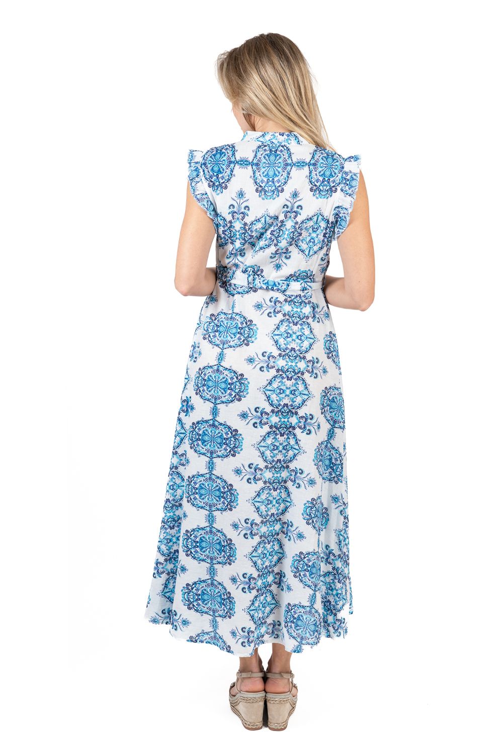 Maxi Cổ V Cotton Isla Bonita, chất liệu lụa mềm mại, cao cấp, nền vải trắng trang nhã họa tiết xanh tinh tế. Có thể mặc cổ V hoặc kéo thành trễ vai. Eo thun