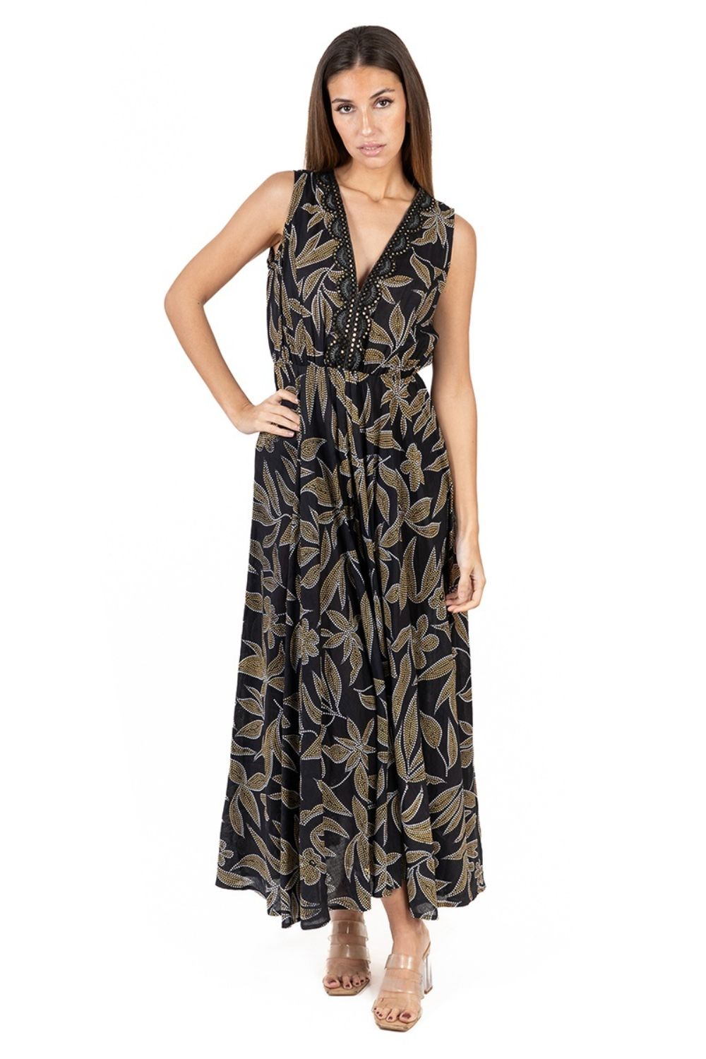 Maxi Hoa Kết Hạt Ánh Bạc Cotton Isla Bonita, chất liệu cotton mềm mại cao cấp, nổi bật phần ren phối trước ngực kết ánh bạc tinh tế, nổi bật, họa tiết hoa vàng trên
