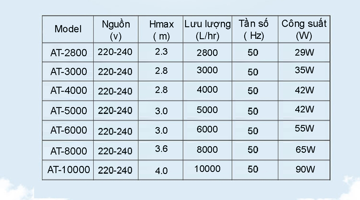 Máy bơm nước ATMAN AT3000 AT4000 AT5000 AT6000 AT8000 AT10000 là dòng máy bơm tiết kiệm điện đáng tin cậy và hiệu quả dùng để bơm nước, cấp nước cho các bộ lọc, ao cá, hồ cá, thác nước hoặc đài phun nước.
